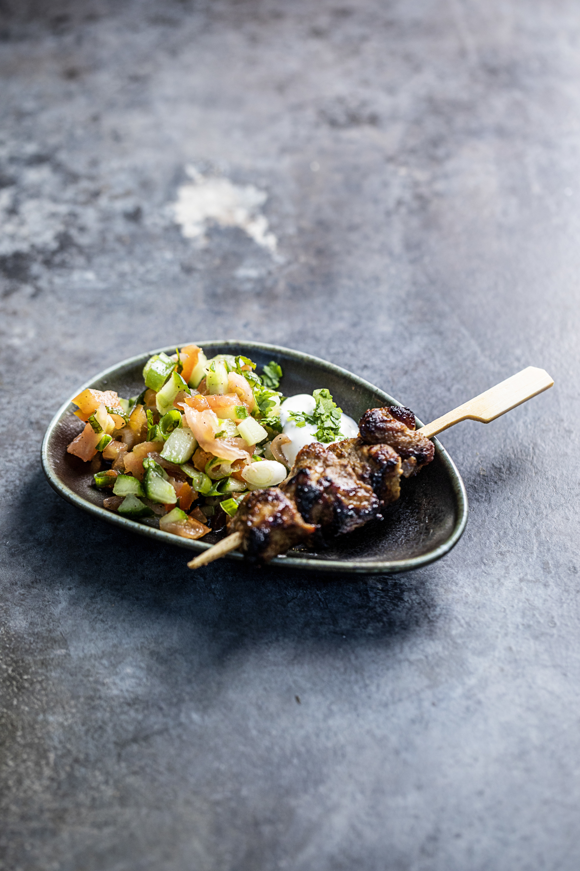 Grillet marineret krondyrfilet serveret med ande-prosciutto, baconsky, skalotter i æbleeddike, salsa af grillede artiskokker & tomater samt skovens urter.