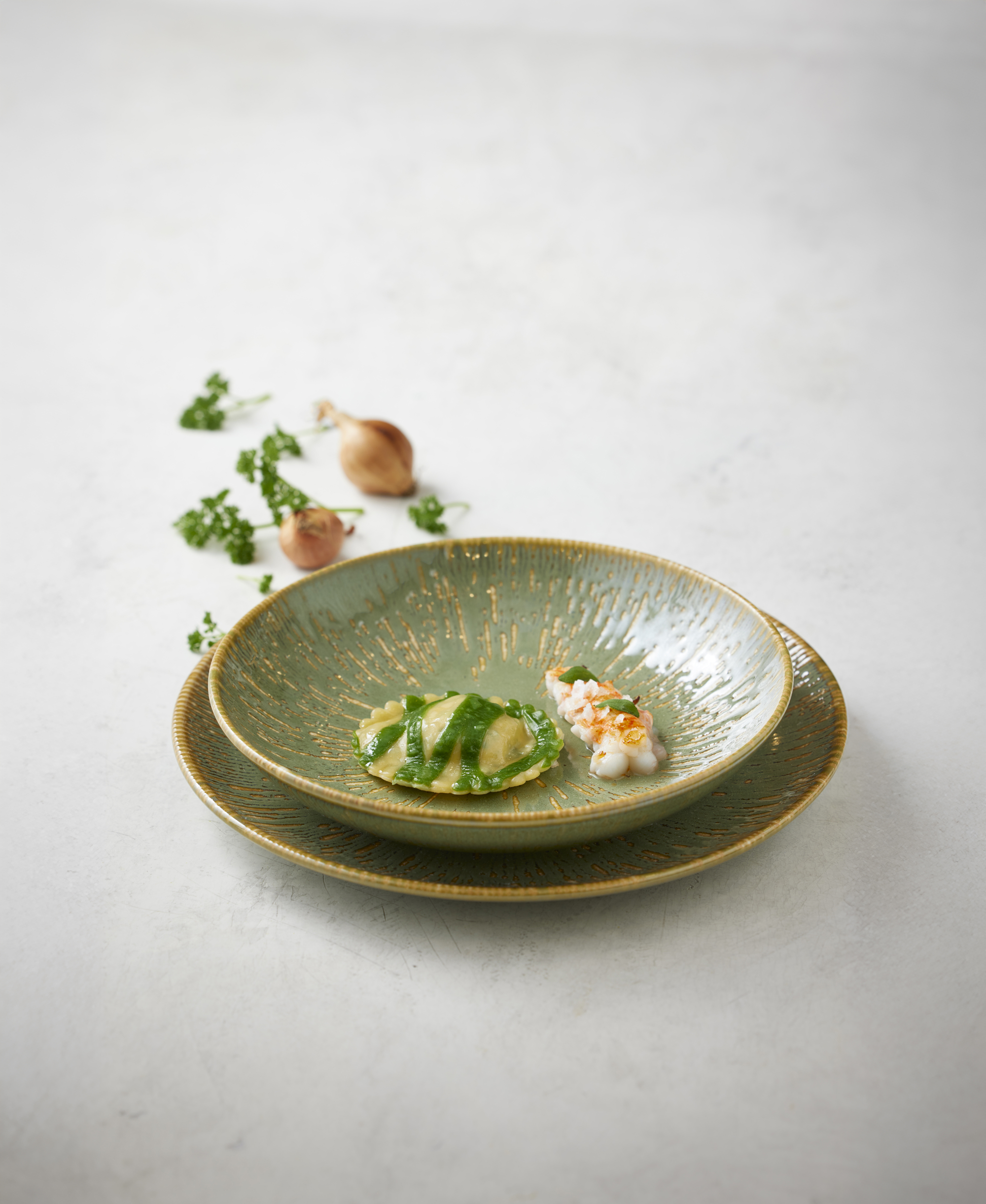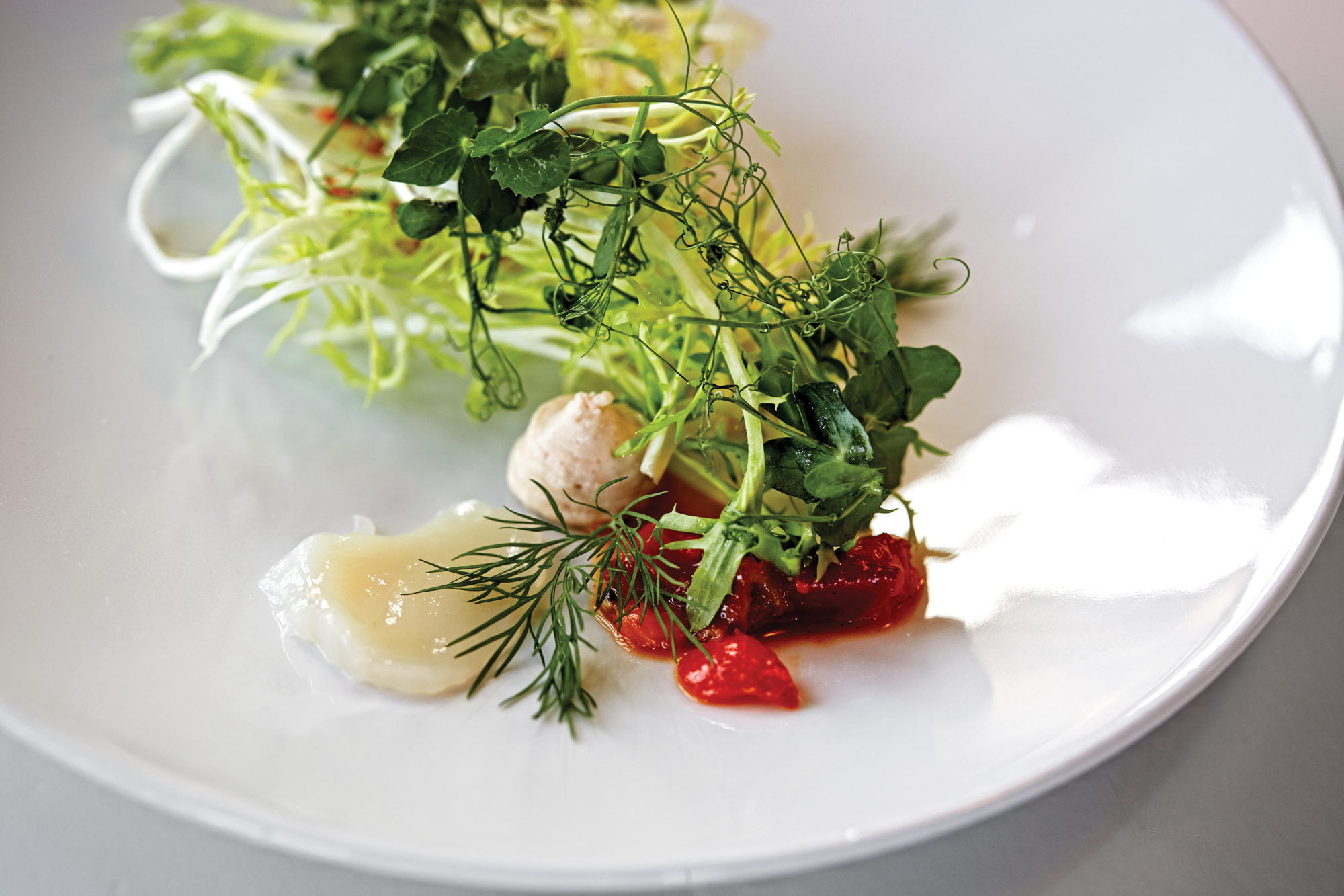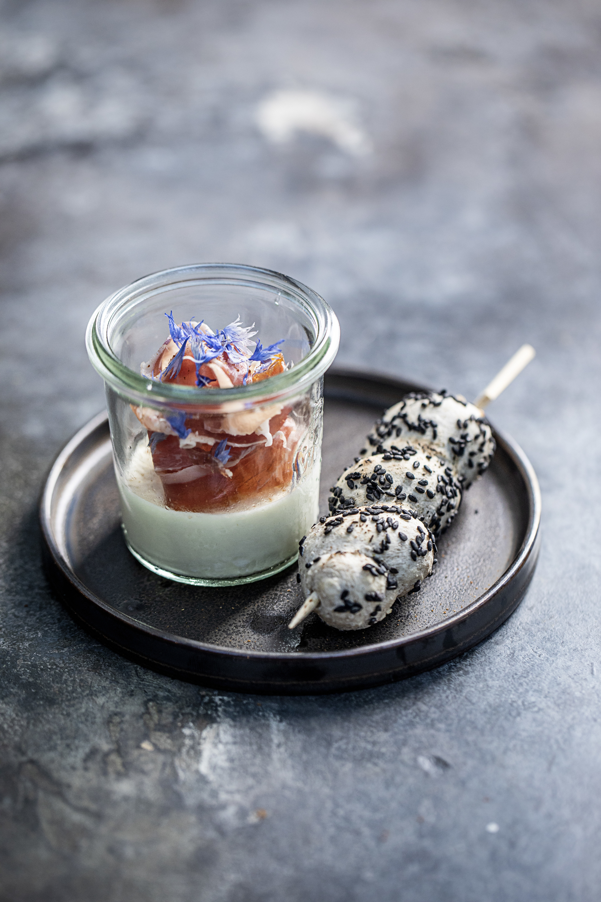 Sommerbuk med fermenterede ærter og glaskål efter opskrift af Hotel Saxkjøbing.