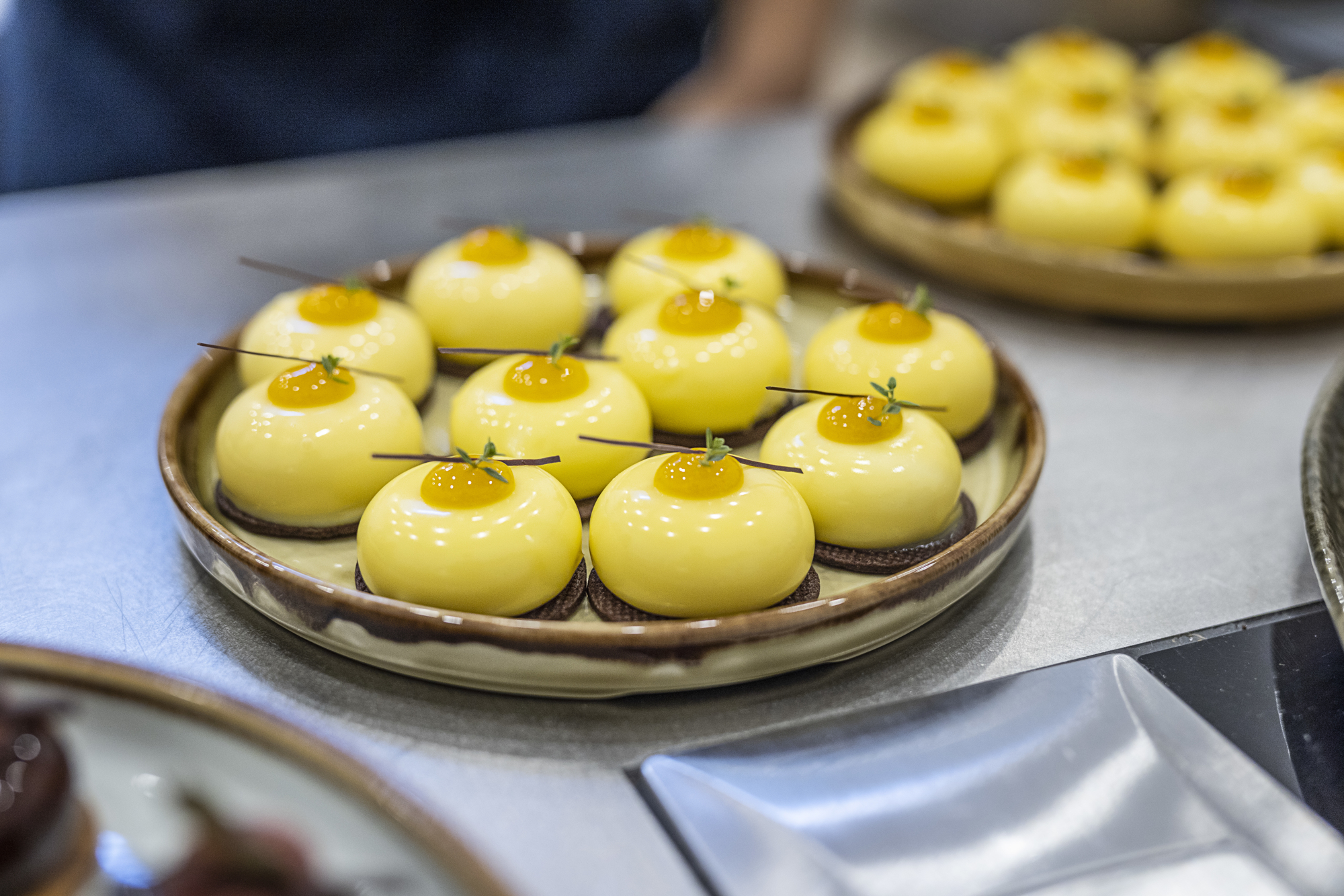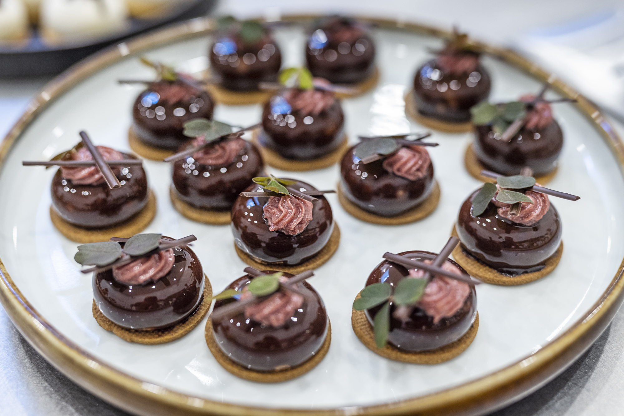 Kraftig chokolademousse med havtorn hertil solbær i madeira, kondenseret mælk og bærculis.
