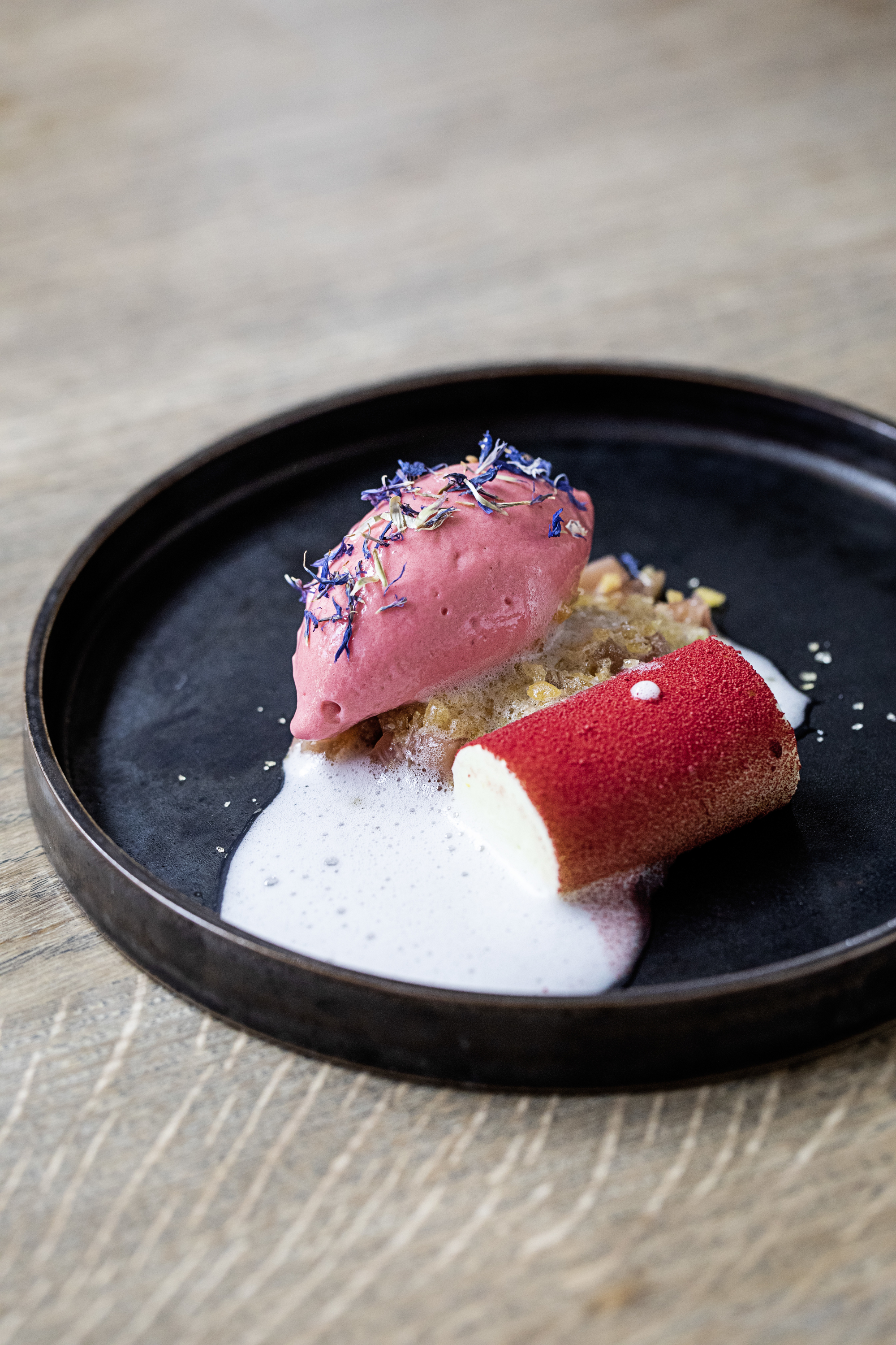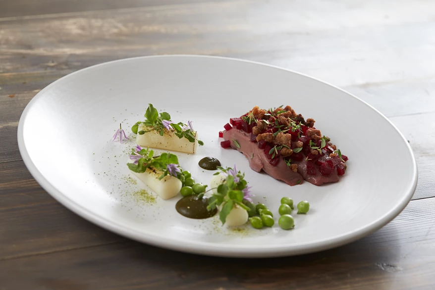 Serveret med selleripure med røget pibemarv, rødvin & balsamicopocherede rødbeder, bagte rødder med mandler, pommes fondant med rosmarin samt kraftig kalveglace.