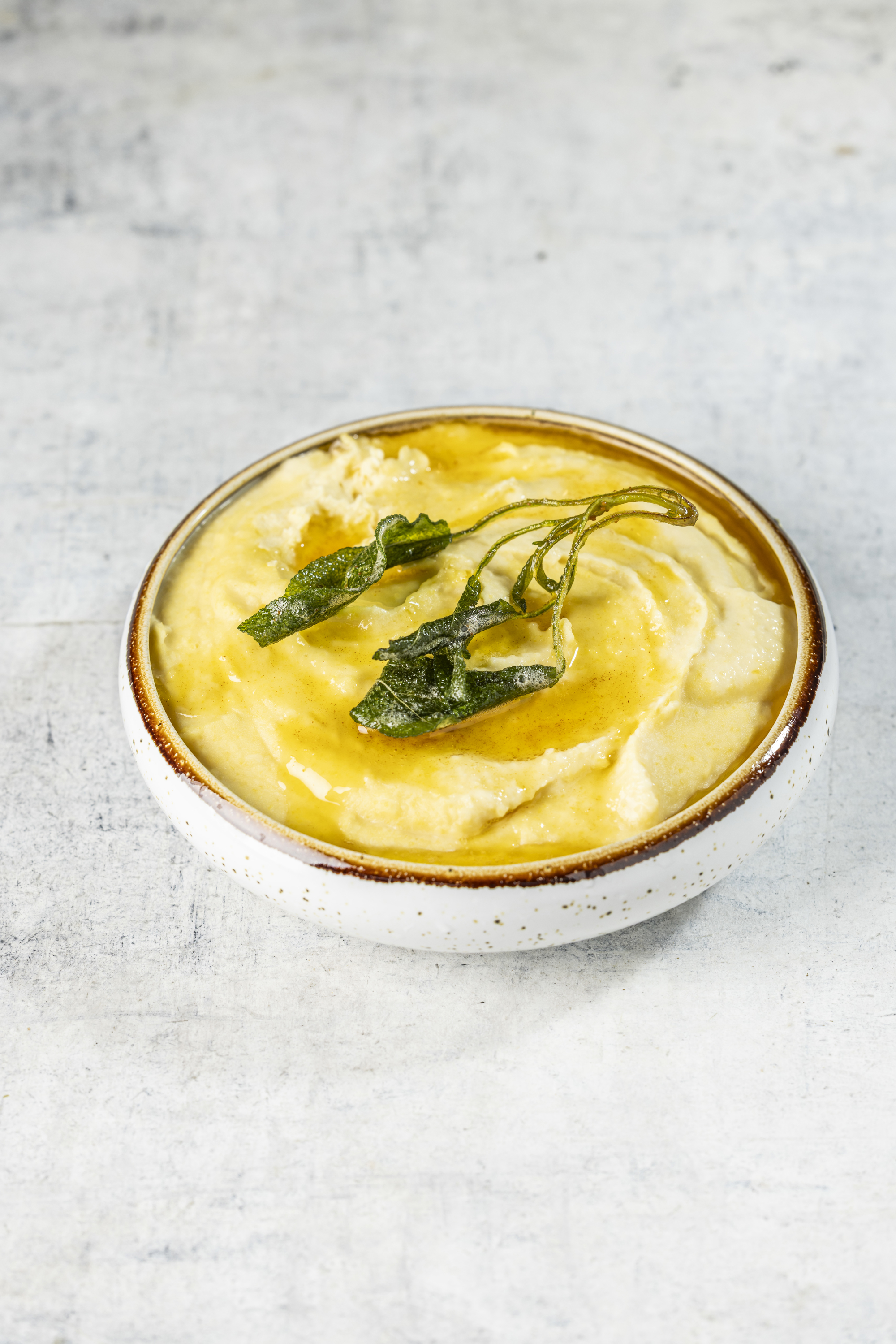 Krondyr med græskar-/gulerodpuré med bagte, marinerede jordskokker