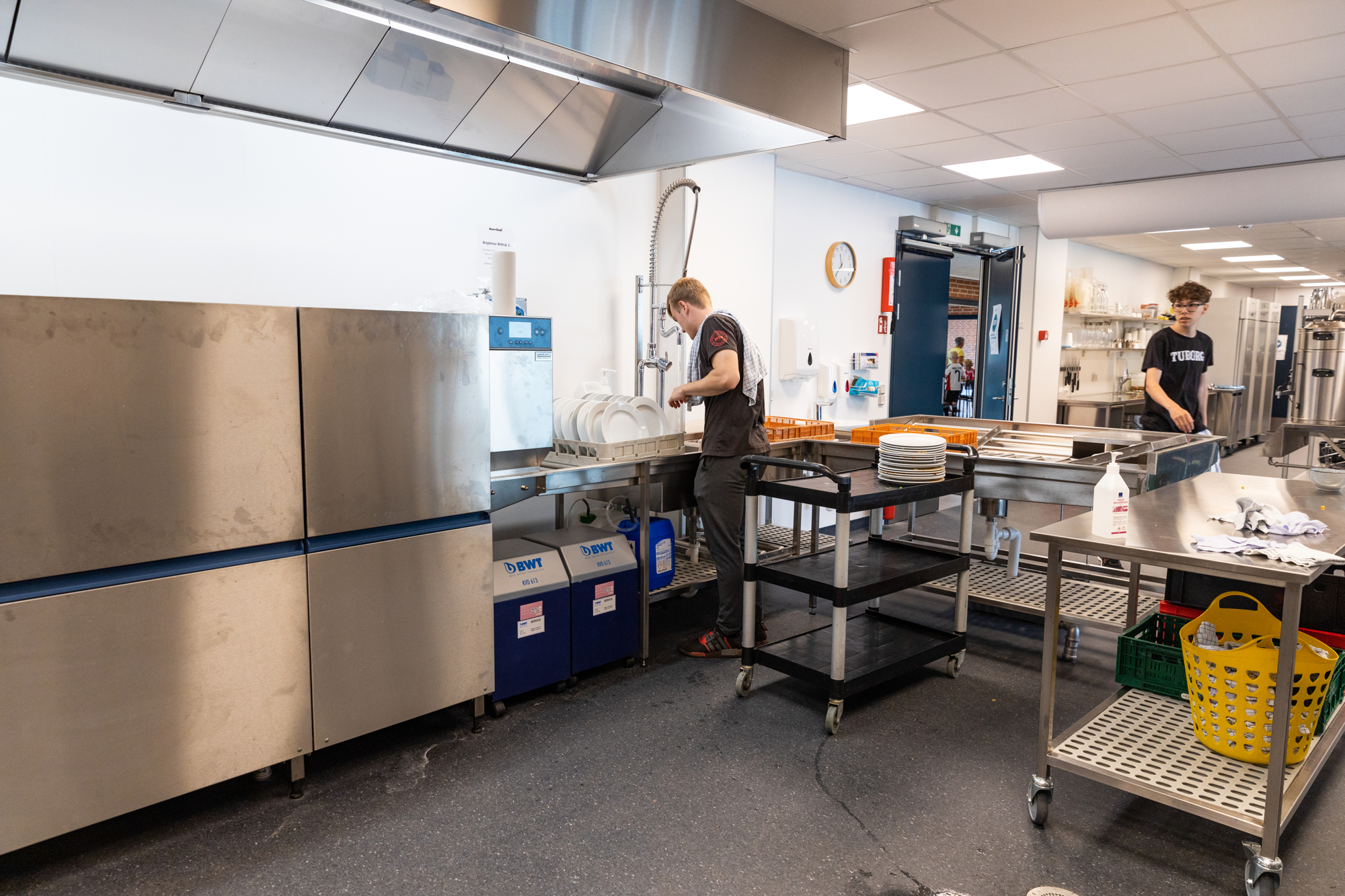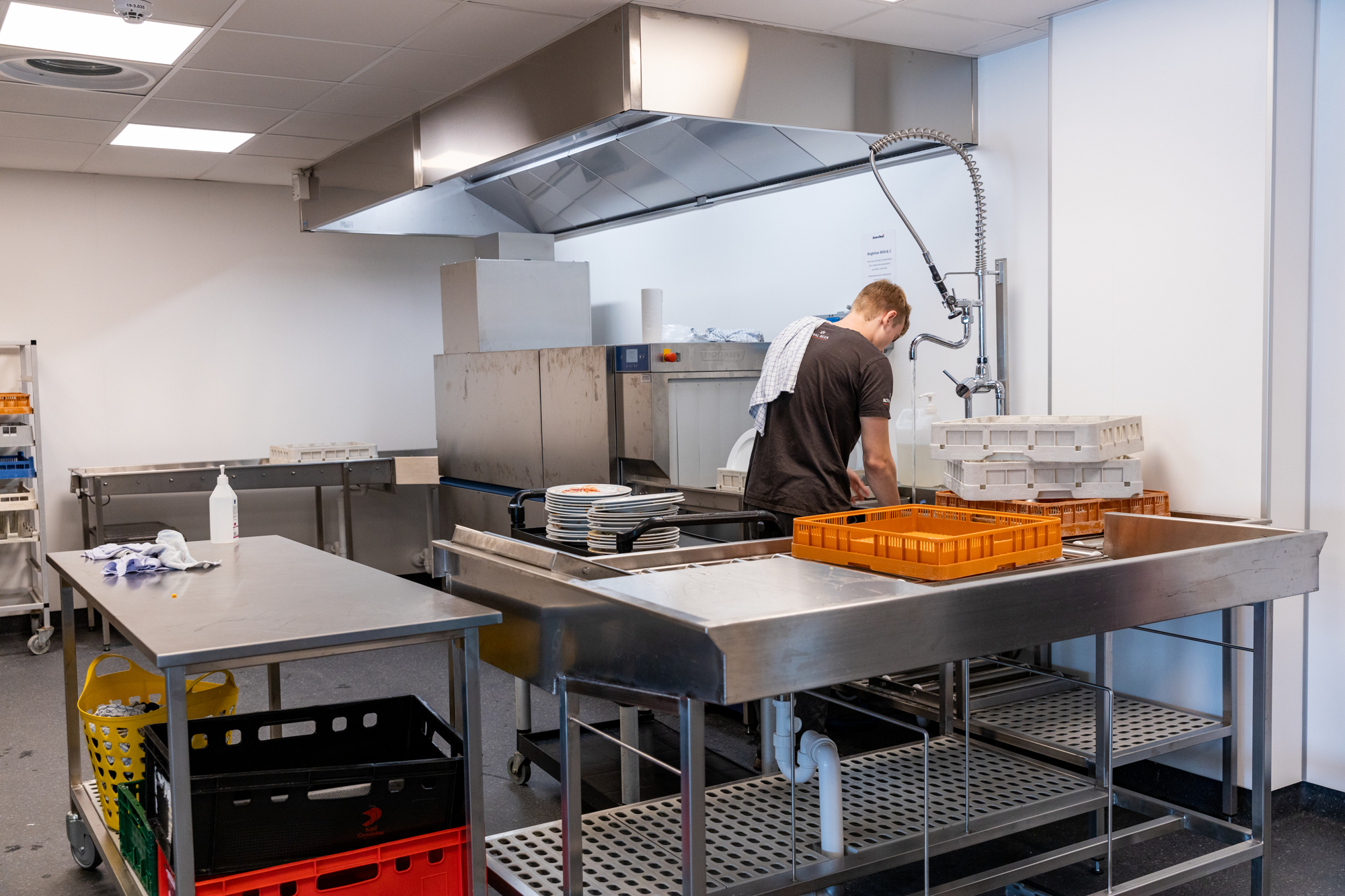 Lotte viser med hænderne, hvortil det gamle køkken gik. ”Tænk, at vi på så lidt plads har lavet mad til 8-900 personer – anretninger, der efterfølgende skulle bæres langt. Og opvasken – den klarede vi i den gamle hættemaskine, som nu er vores grovopvask,” siger den garvede køkkenleder og peger på afløseren – en HOBART tunnelopvask med perfekte arbejdsbetingelser for forvask og afsætning.