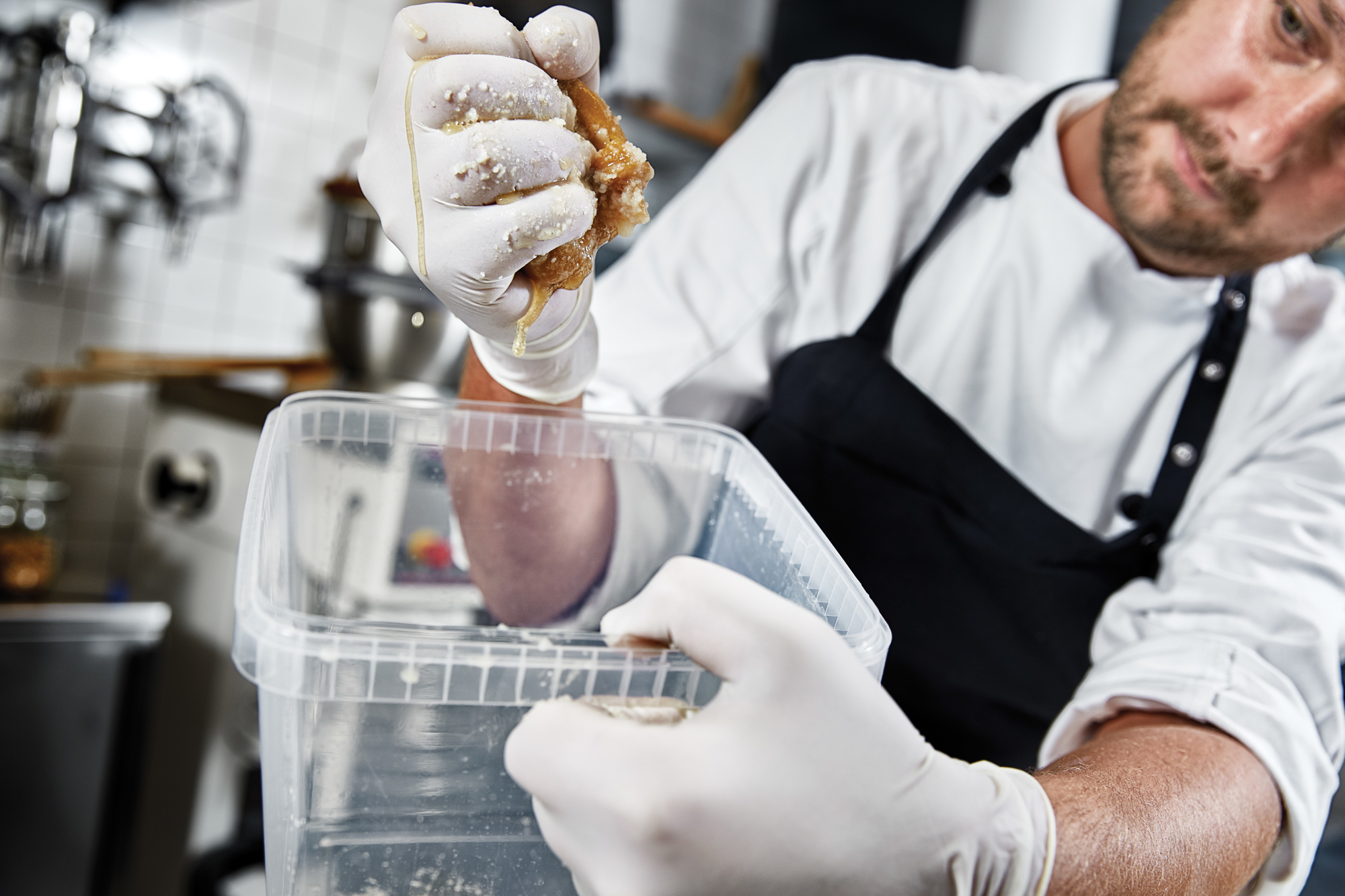 "Egentlig var det Mike, min kokke-kammerat, der satte gang i citronsylteriet," fortæller Thomas og henter en slikbøtte frem med en kraftig sirupsagtig substans, der har syv år på bagen. "Efter et år begynder skallen at blive god, og efter et par år vil saften/olien fra citronerne begynde at blive sirupsagtig. Smagen bliver mere og mere intens med alderen, så nu har vi saltsyltede citroner i flere aldersklasser til forskellige formål. I begyndelsen skar vi citronerne op i både, men vi har fundet ud af, at hele citroner med et par snit i begge ender er nok. Det er billigt, det passer sig selv, og det giver spændende, god smag."