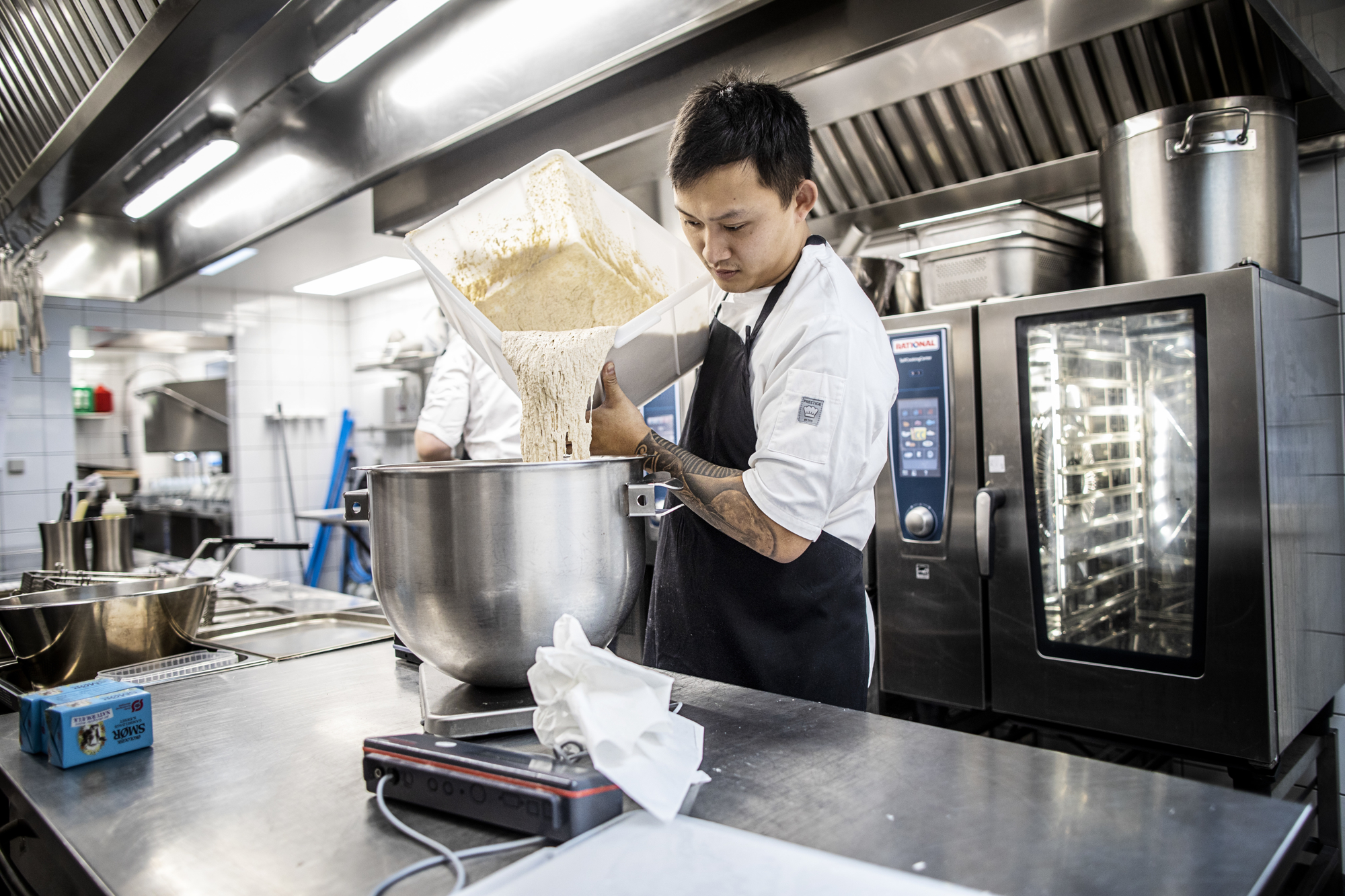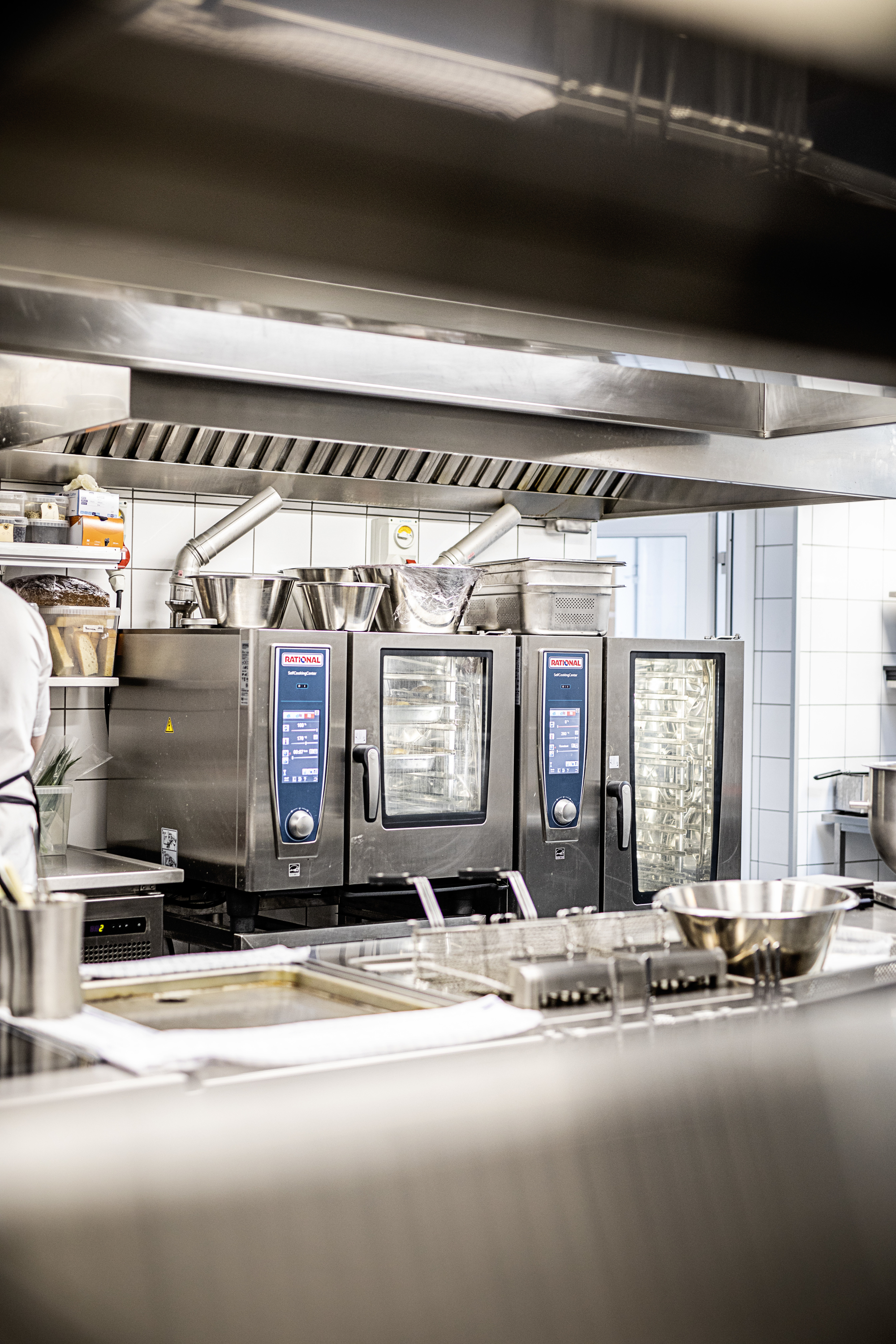 Det gamle køkken blev ryddet, så Per Plesner fra BENT BRANDT havde mulighed for at starte forfra med alt: Rational ovne, MKN komfurer, Hobart opvask specialborde og koldt køkken. Med en placering midt i huset og tæt på gæsterne var ventilationen vigtig, og den stod sin prøve i en meget hektisk sommer i 2020.