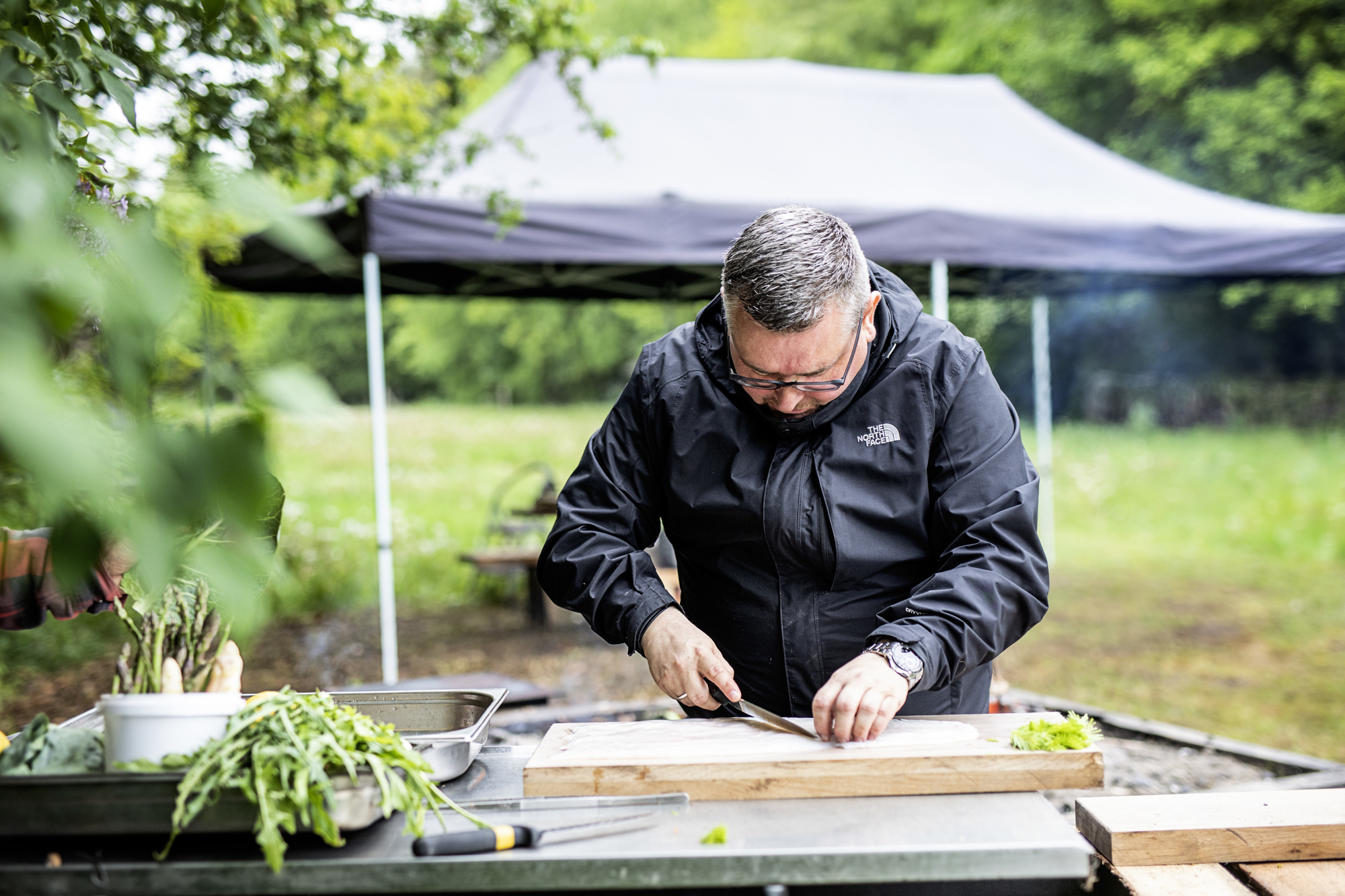 For kammeraten og kollegaen Dennis, kok og inspirationskonsulent hos BENT BRANDT, er den sirlige gastronomi sat på hold, mens den udtænkte bålmenu udvikler sig i takt med fundet af vilde urter og friske granskud på restaurantens 30 tdl. store område.