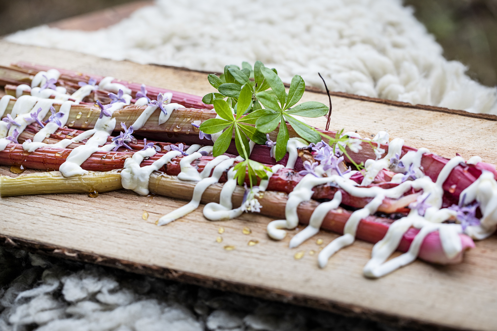I det høje bål-bed placeres et udbenet lammebryst, der kunstfærdigt spændes ud på 3 metalstænger, så det over et par timer grilles perfekt af strålevarmen fra bålet, før det serveres med flækkede, grillede hvide asparges. På bålpladsens indbyggede grillrist varmes der godt op med egetræ, så den opskårne blæksprutte ikke kun koger, men bliver delikat grillet. Dennis har forsigtigt ridset blæksprutten på kryds og tværs og krydret med friske granskud. Tilbehøret er grillede citroner og julesalat. Og for at få det sidste af aspargessæsonen med, grilles grønne asparges, der får selskab af mandler og revet parmesan. Desserten er grillede rabarber serveret med græsk yoghurt og flydende honning.