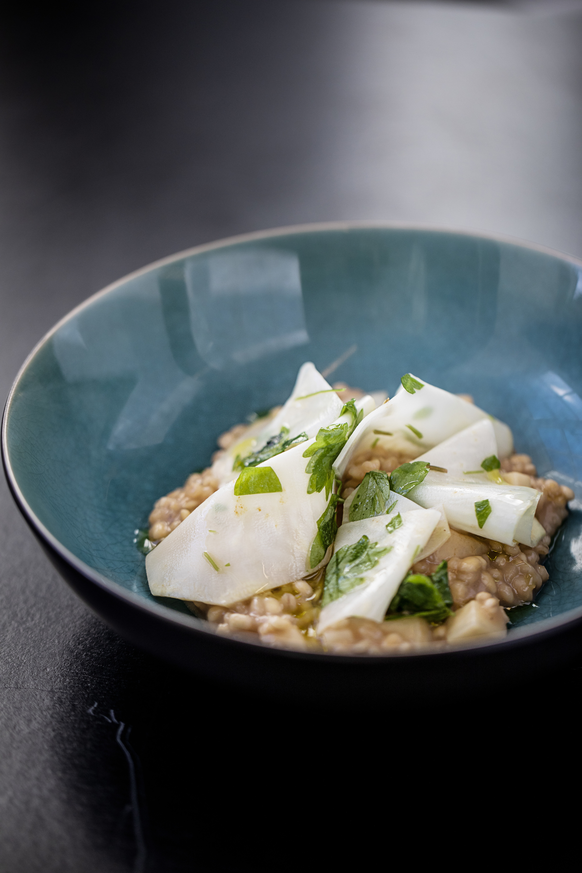 "Vi bruger alt, så vi undgår madspild, og vi kan servere kød, fordi det kun kræver 10-14 kilo, når vi portionsanretter. Og der er fremragende soyaprodukter, der både kan tilføre smagen af svampe og give struktur i en kødsovs. Vi fermenterer og eksperimenterer, så vi også kan opfylde specielle ønsker – som f.eks. når en af husets bornholmskfødte medarbejdere foreslår Gudhjems Dyppe til den næste omgang kogt torsk," fortæller køkkenchefen, som også er stolt af sin økologiprocent, der er på godt og vel sølvniveau.