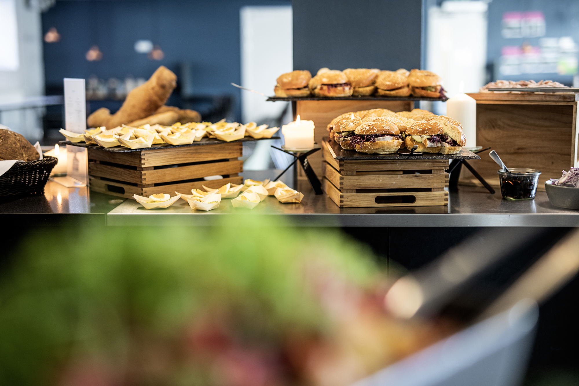 Den faste disk er suppleret af 2 mobile enheder, hvor salatbaren og det kolde anrettes – ofte også som portionsanretninger – og en disk med stenbordplade, hvor der kan eksperimenteres, og hvor også husets lækre brød placeres. En rustik, hyggelig præsentation med trækasser og skiferplader, som passer godt til stemningen i kælderen.