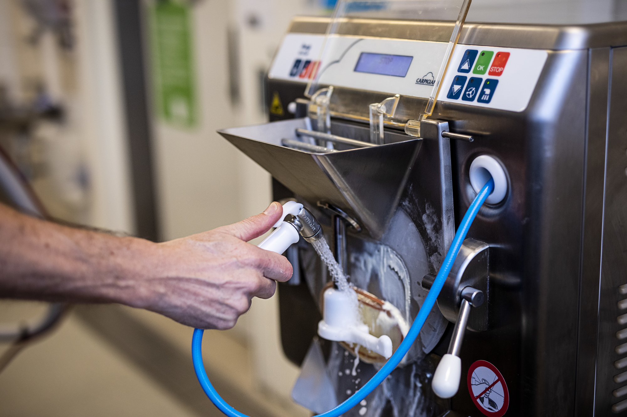 Også rengøring af maskinen er nem, konstaterer Michel, der med målgruppen in mente har meget stor fokus på hygiejne. "Isen tappes gennem en rist på maskinens front, mens spartlen roterer og cylinderen tømmes helt for is. Med kun 1 liter varmt vand fra maskinens brusehoved og en smule sæbe rengør det automatiske rengøringsprogram maskinens cylinder, mens spartel og andre remedier fra produktionen får en tur i opvaskemaskinen."