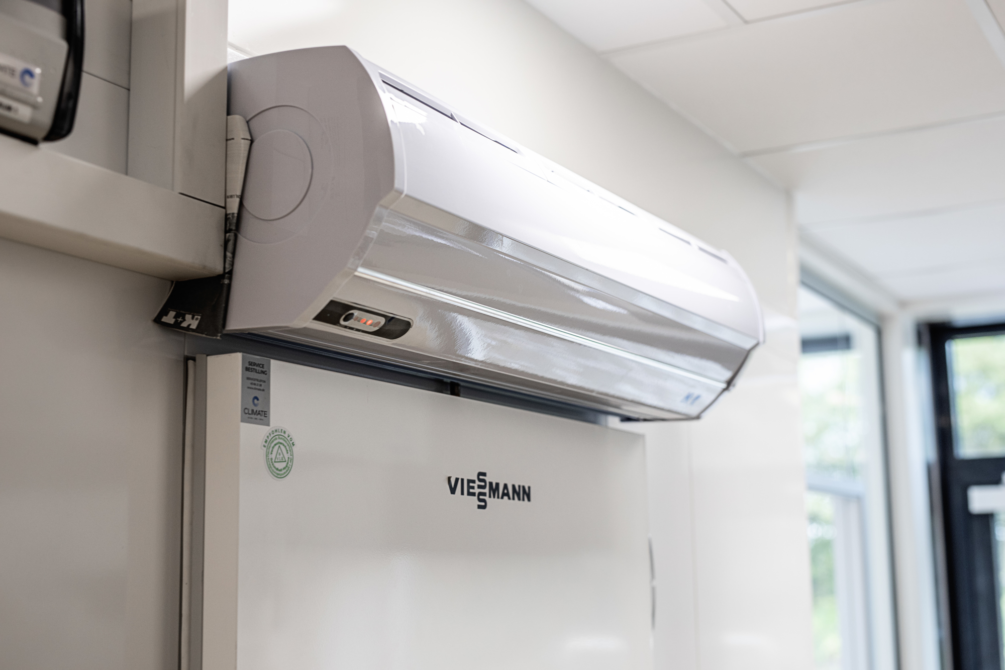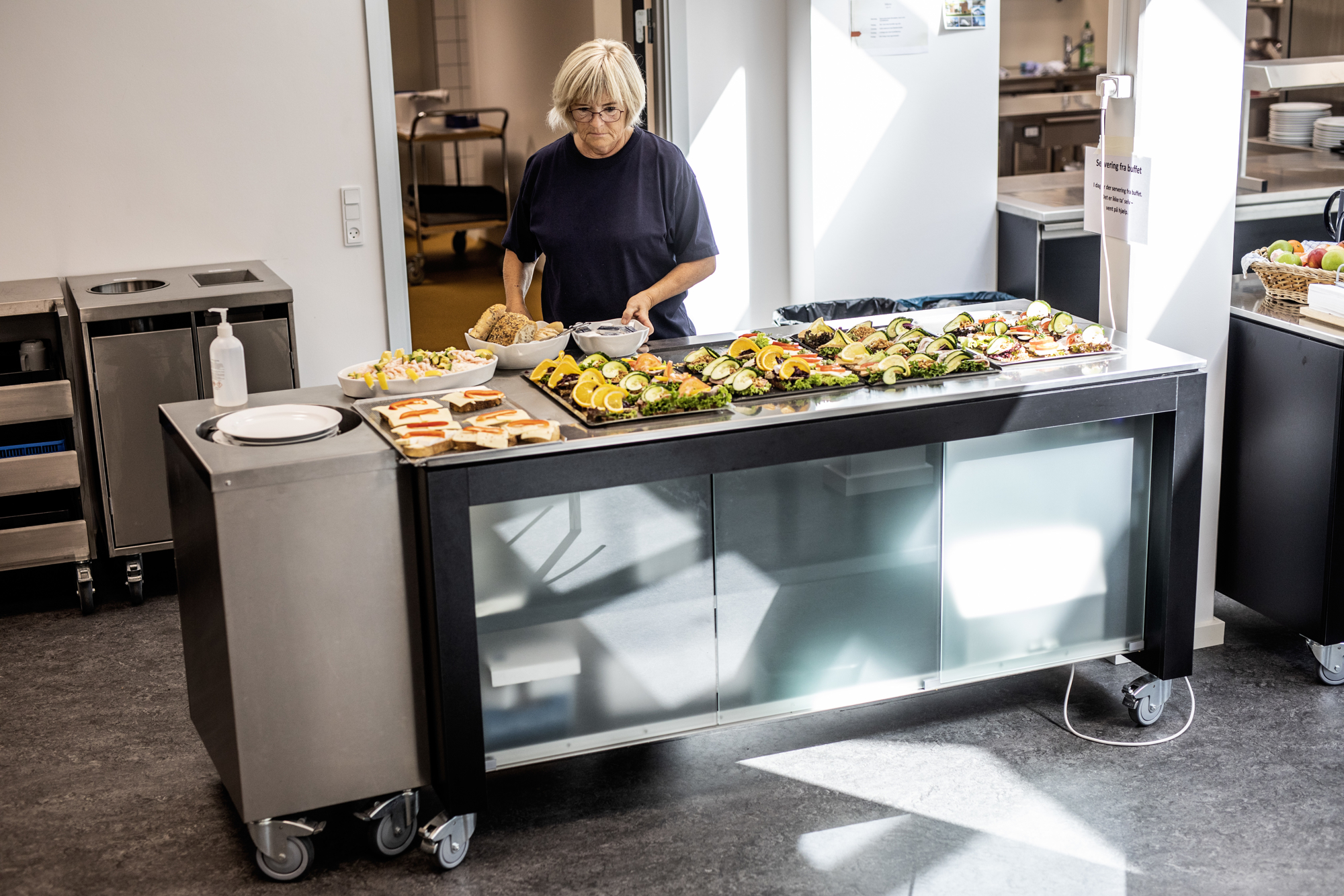 En åbning i muren mellem kantine og køkken tjener som plads for salatbar og varmholdning. Men myndighederne stiller krav til en sådan åbning. Et metaljalousi og et brandsikkert gardin ruller automatisk ned, hvis sensorerne registrerer brand.