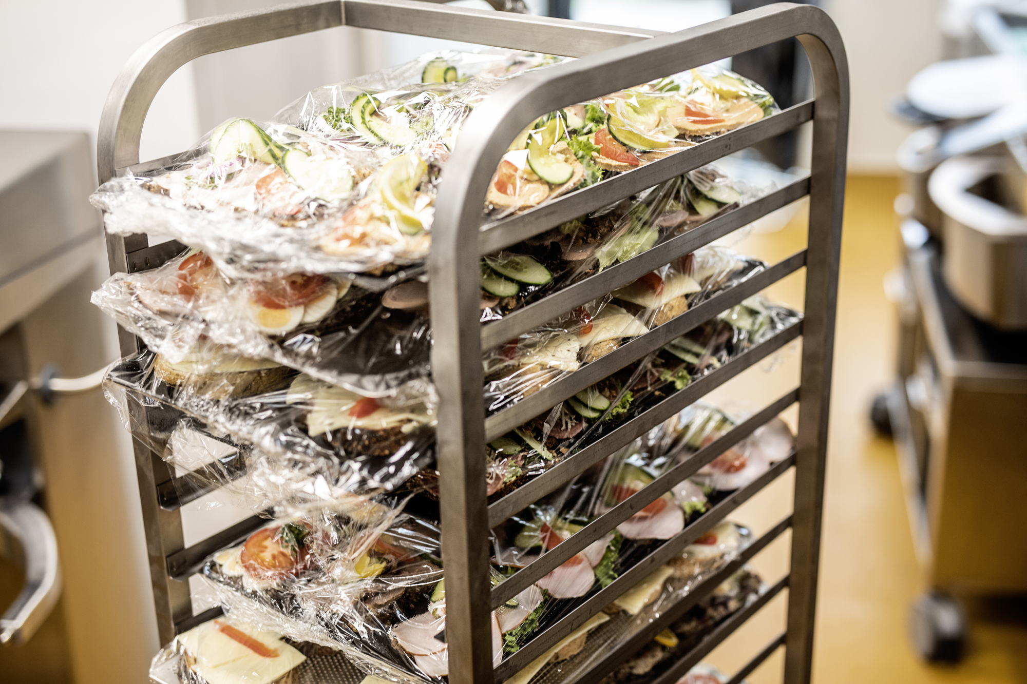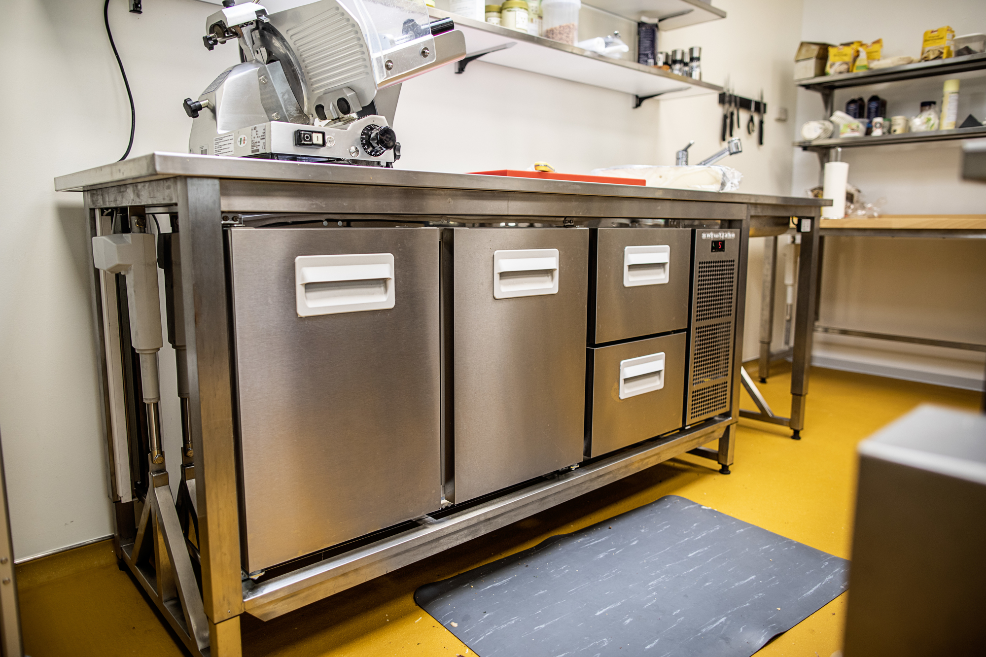 1 til køl og 1 til frost. Kølerummet befinder sig lige over for Rational-maskinerne under det gennemgående emfang. For at forhindre, at emfanget suger kulden ud af kølerummet, når døren åbnes, er der monteret en blæser, som skaber et lufttæppe foran døren. Det giver store energibesparelser.