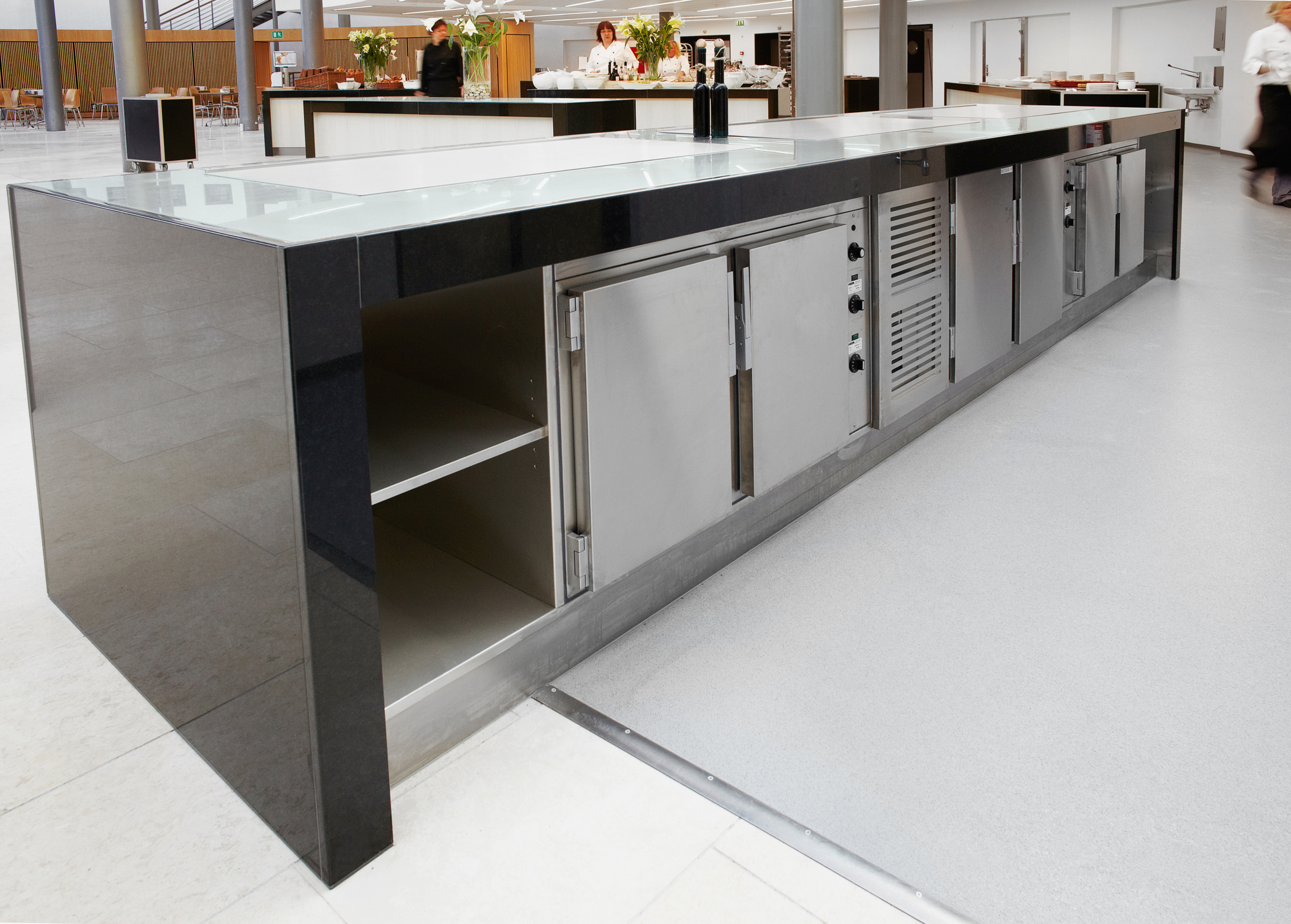 Kantinen er opbygget omkring buffeter/diske fremstillet i granit, glas, finer og rustfrit stål.