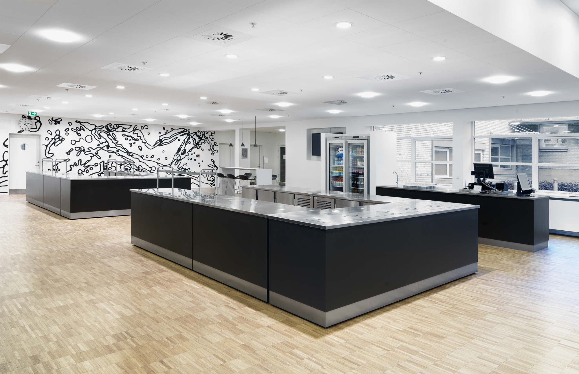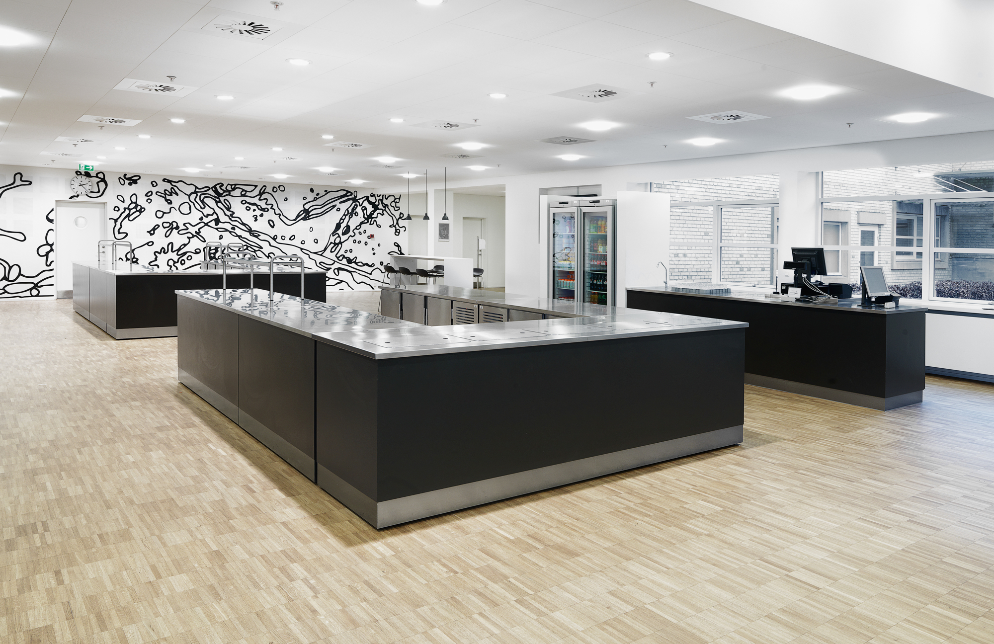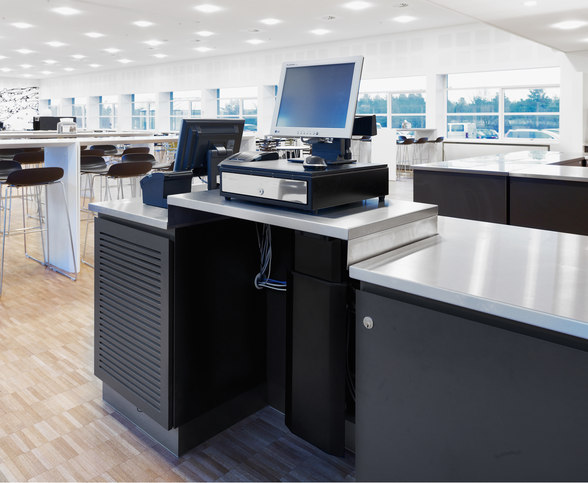 Drikkenichen i buffetområdet skærmer for afrydningen i baggrunden, hvor der er direkte åbning til opvasken. Kasseøen er med hæve-/sænkefunktion.