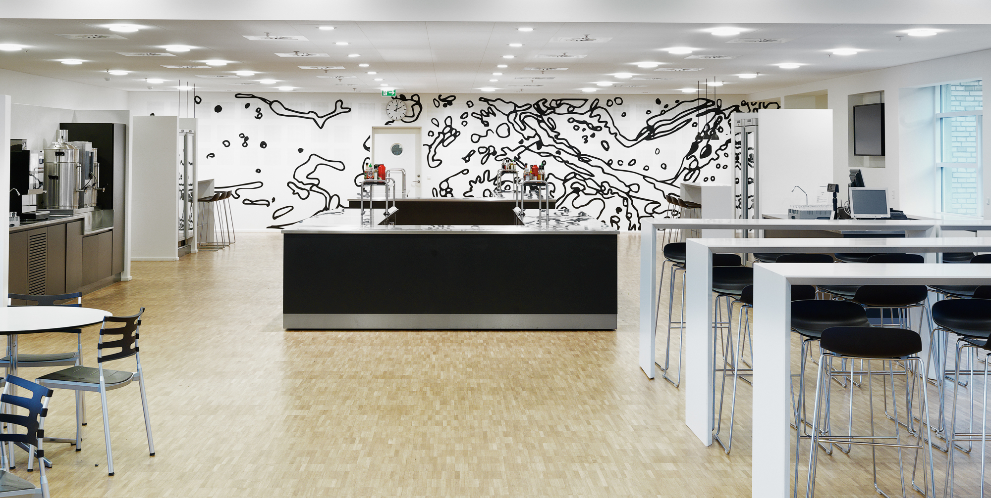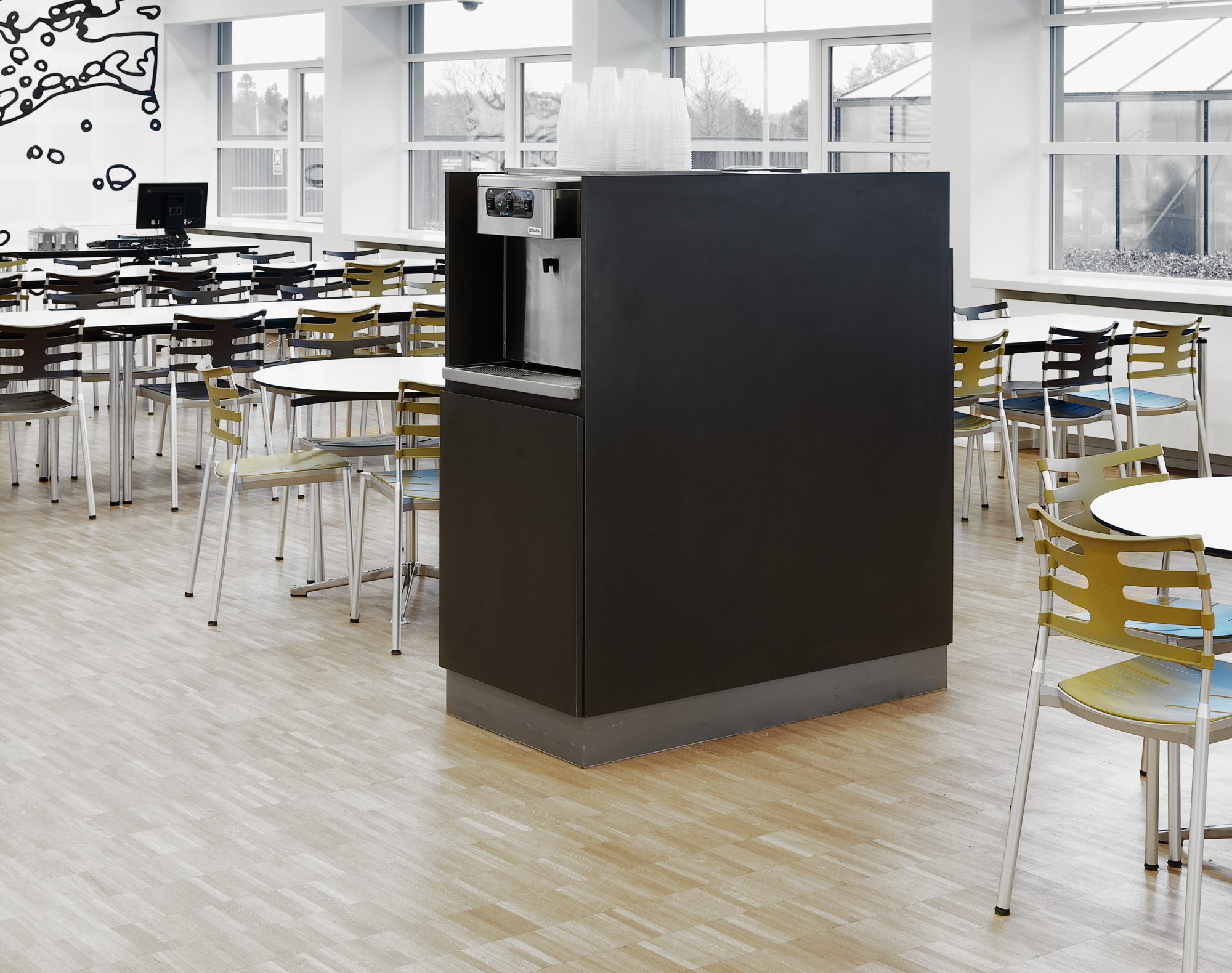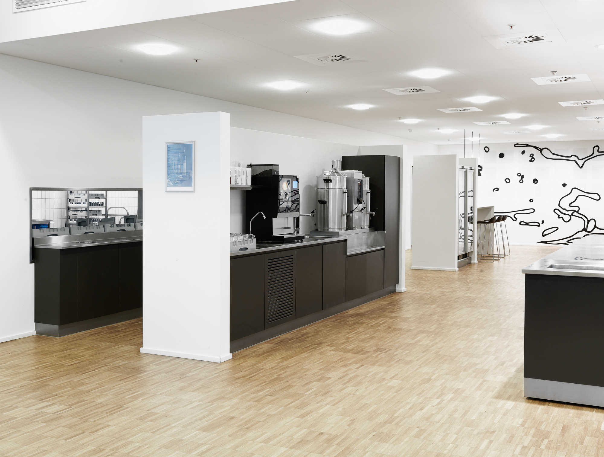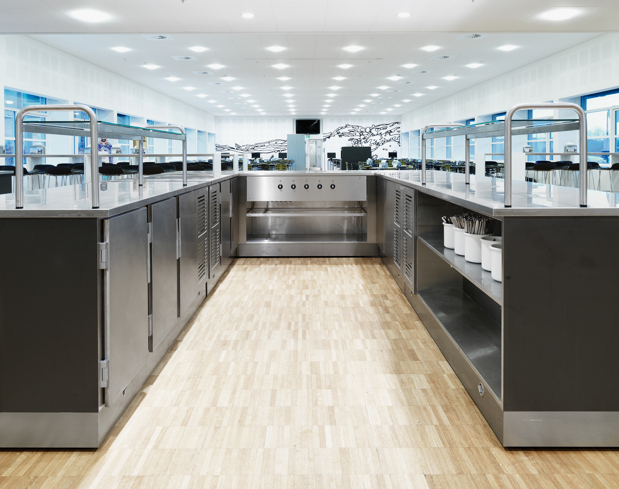 Drikkenichen i buffetområdet skærmer for afrydningen i baggrunden, hvor der er direkte åbning til opvasken. Kasseøen er med hæve-/sænkefunktion.