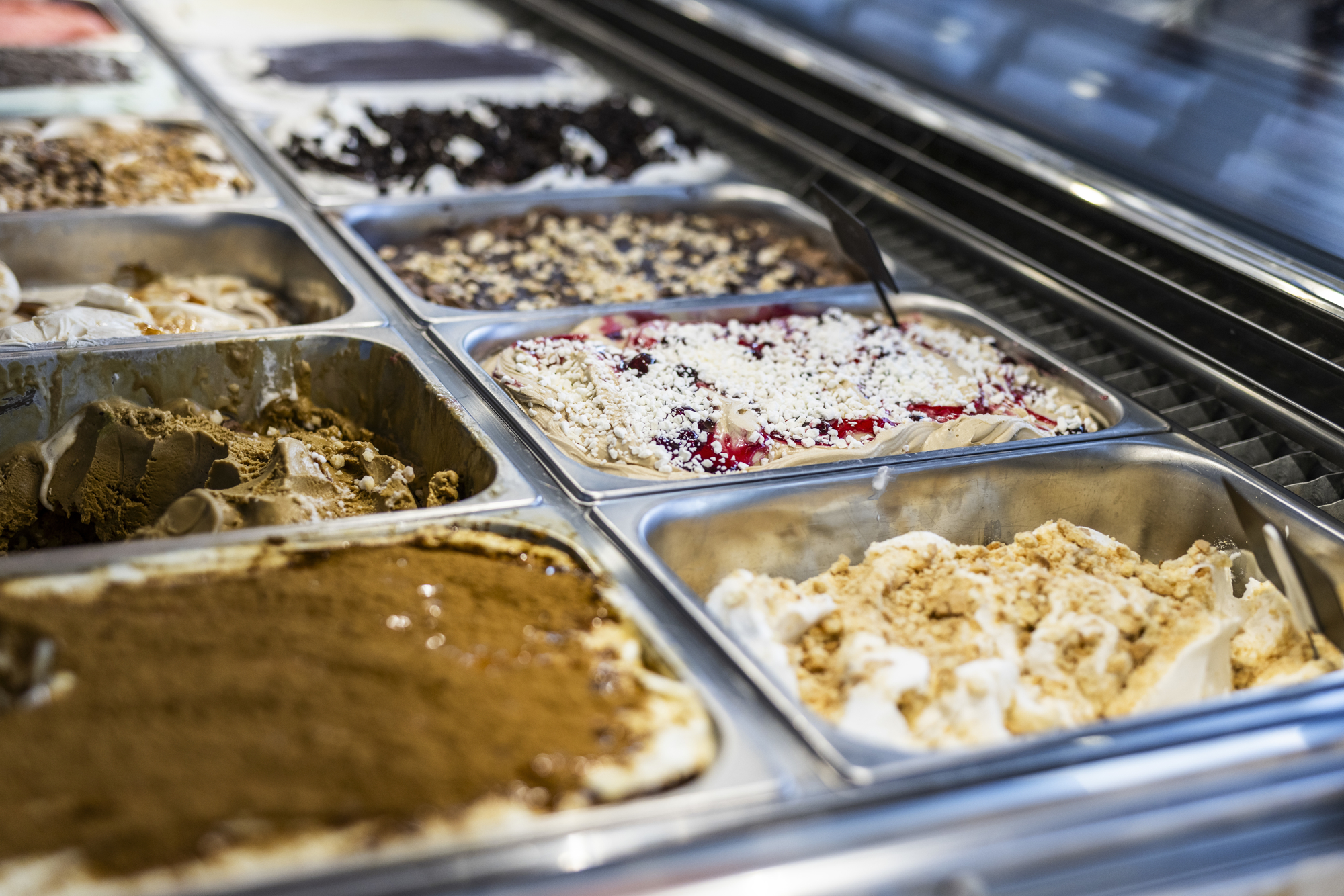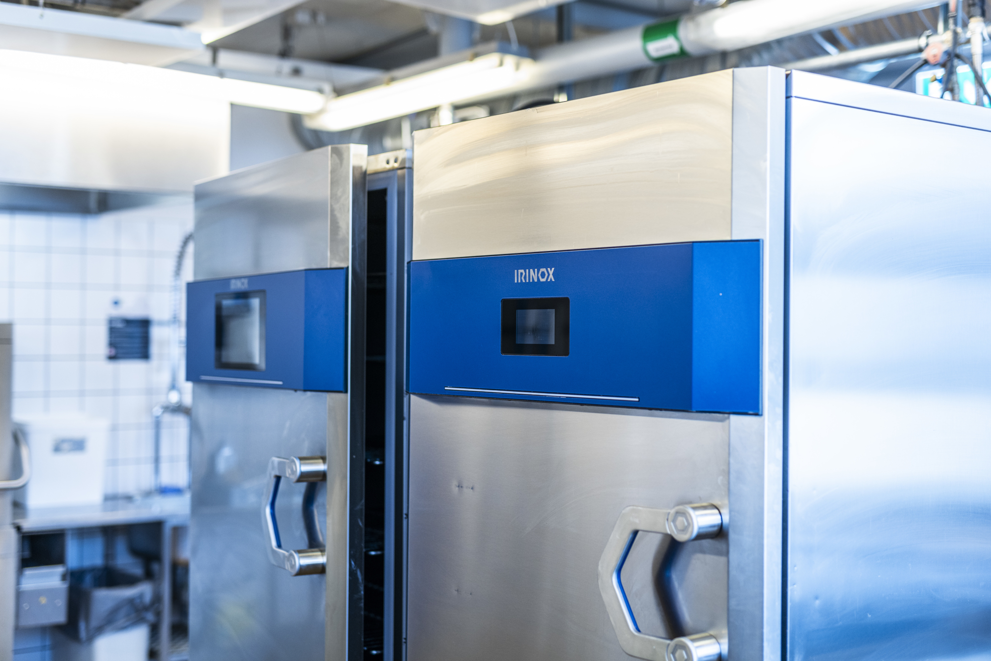 2 Irinox blæstfrysere, der køles med energibesparende propangas og -40° luft, står klar til at nedkøle den -7° kolde is fra ismaskinerne til -15° på 15 minutter, så iskrystaller undgås. Herefter flyttes de på lager i 2 Irinox fryseskabe bag disken i butikken. Rettidig produktion af de 40 varianter – og ugentlige nyheder – styres på iPad af et selvudviklet program.