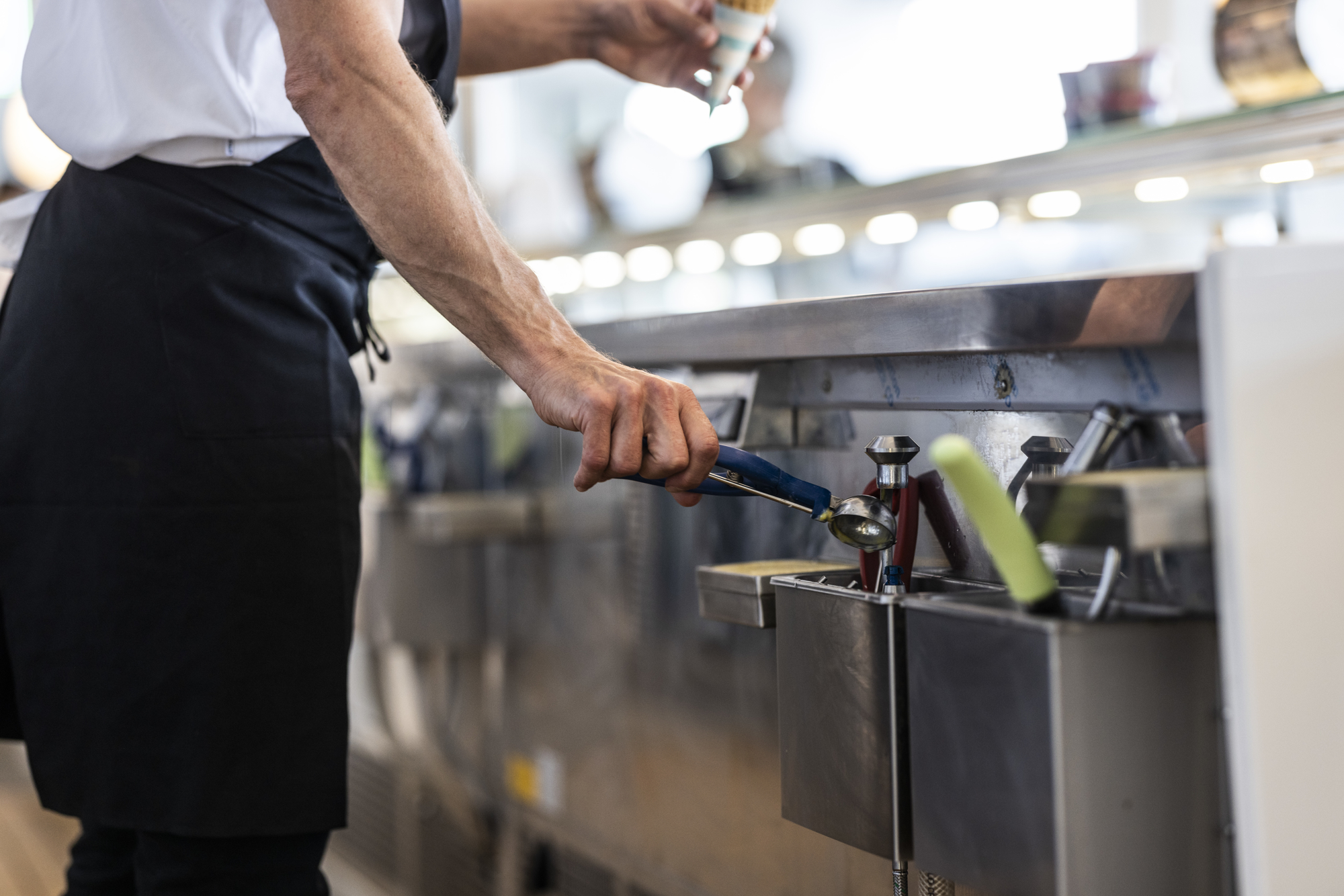 ”Idéerne til isdisken har jeg fået på mine mange rejser i udlandet – og ikke mindst fra den tur, jeg havde til Italien sammen med konsulent Frants Pedersen fra BENT BRANDT,” fortæller Kim. ”Disken skal jo både være en velfungerende arbejdsplads og et blikfang. I fronten er der plads til præsentation af 400 liter is i 40 varianter. Også en chokoladevarmer, Carpigiani softicemaskiner til Kims hje melavede softicemix, guf og drys, lyddæmpede blendere til milkshakes med kandevask indbygget i bordpladen, kaffemaskiner og kolde drikkevarer er sammen med betaling tænkt ind i et flow, hvor 9 medarbejdere ikke går i vejen for hinanden.”