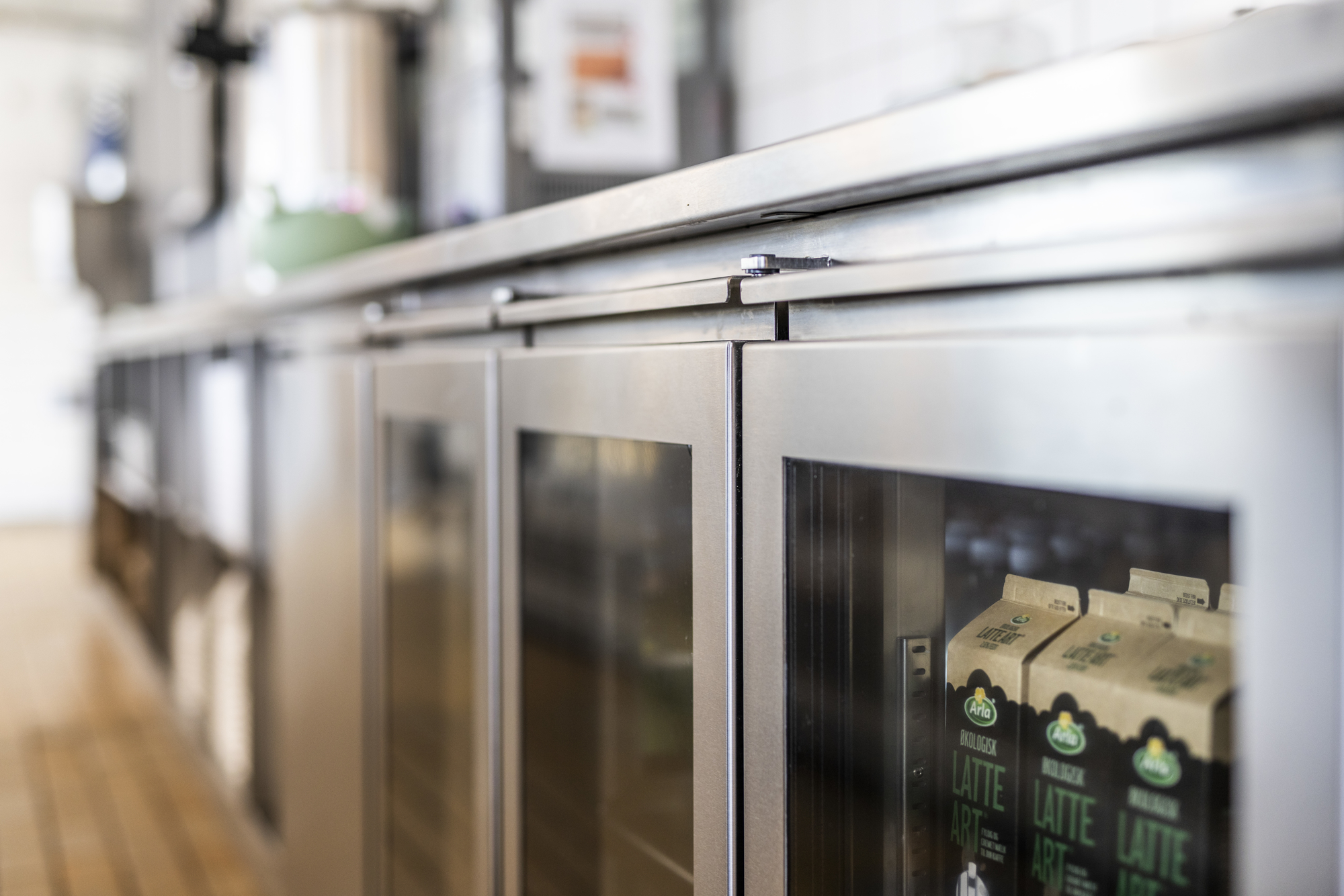 ”Alle skal ind og ud af en lille blå dør, som er ens i alle butikkerne i Kødbyen,” forklarer Kim. ”Området er udpeget som et af Danmarks 25 industriminder, så bygningerne er fredede, og det giver mange udfordringer. Men det giver også lokalerne et helt unikt udtryk,” konstaterer den kokkeuddannede ismager.
