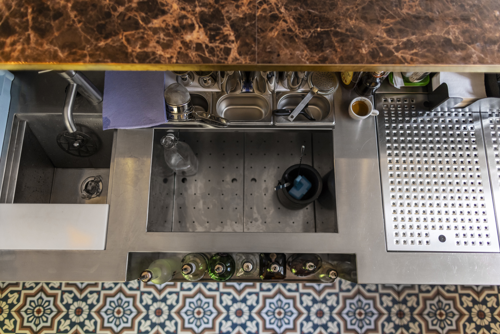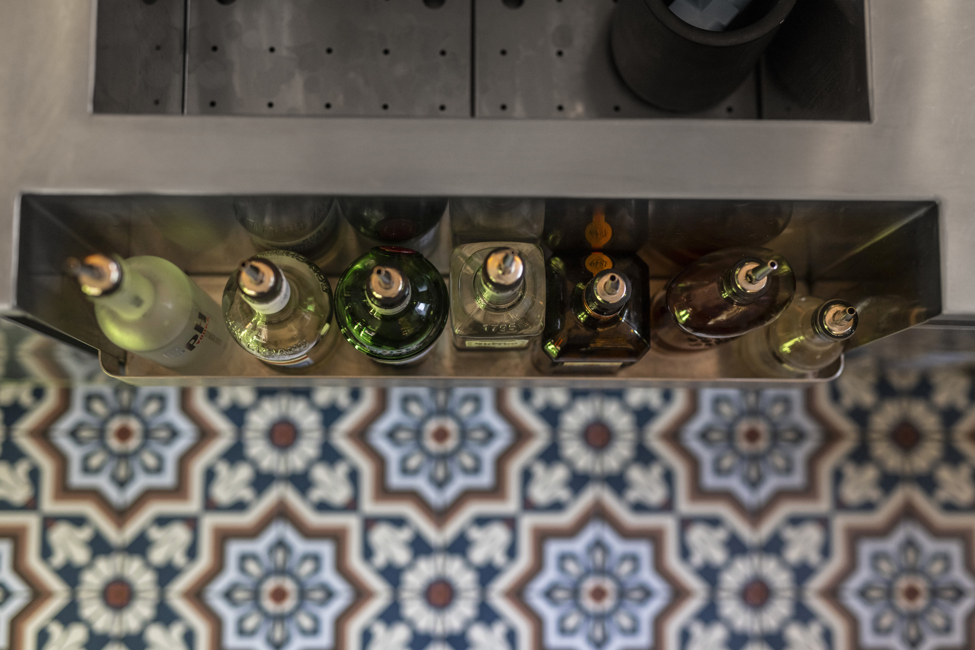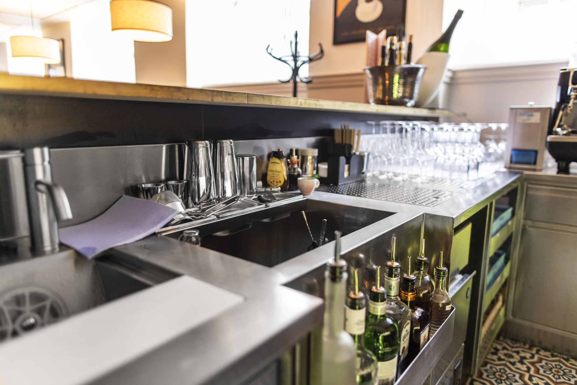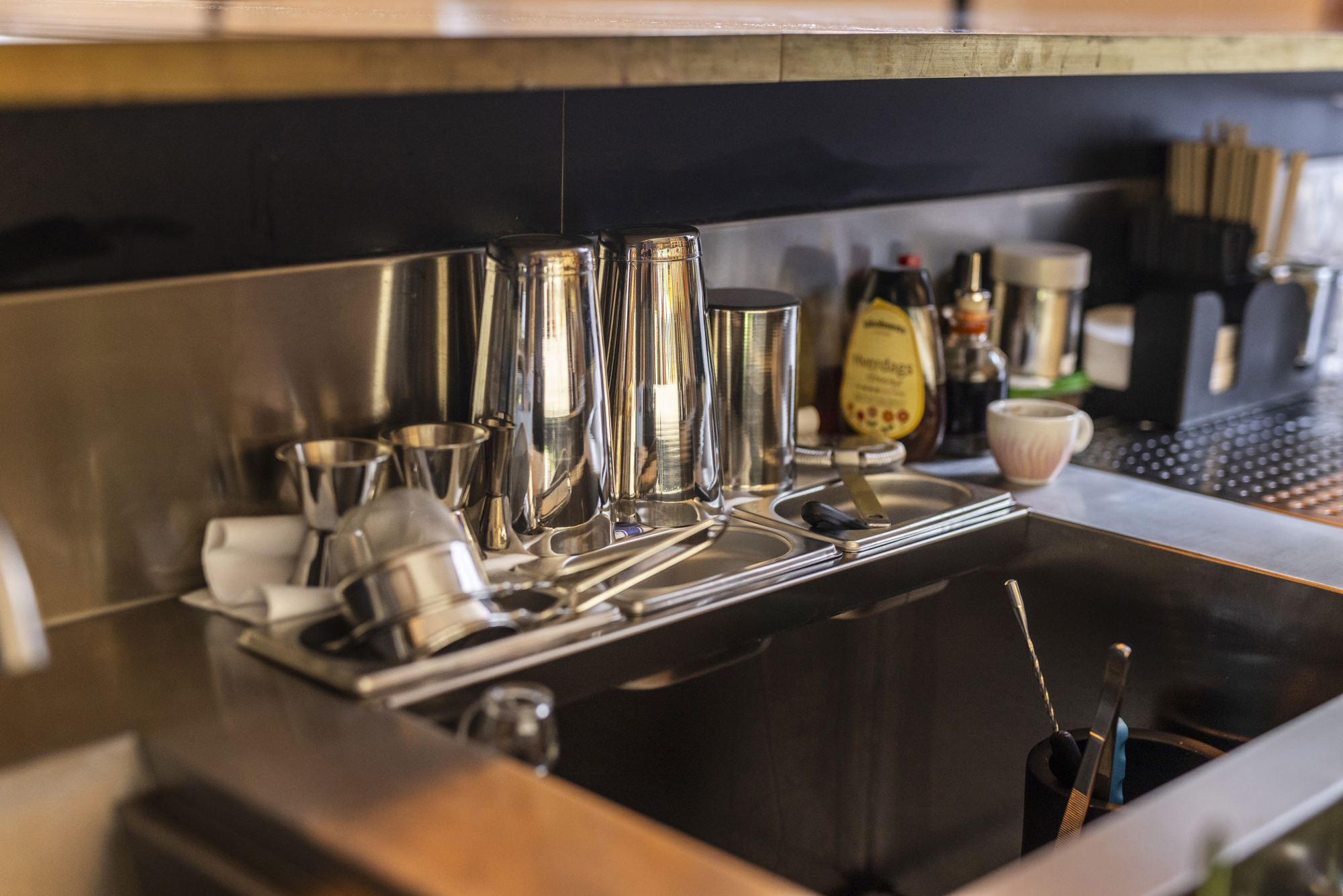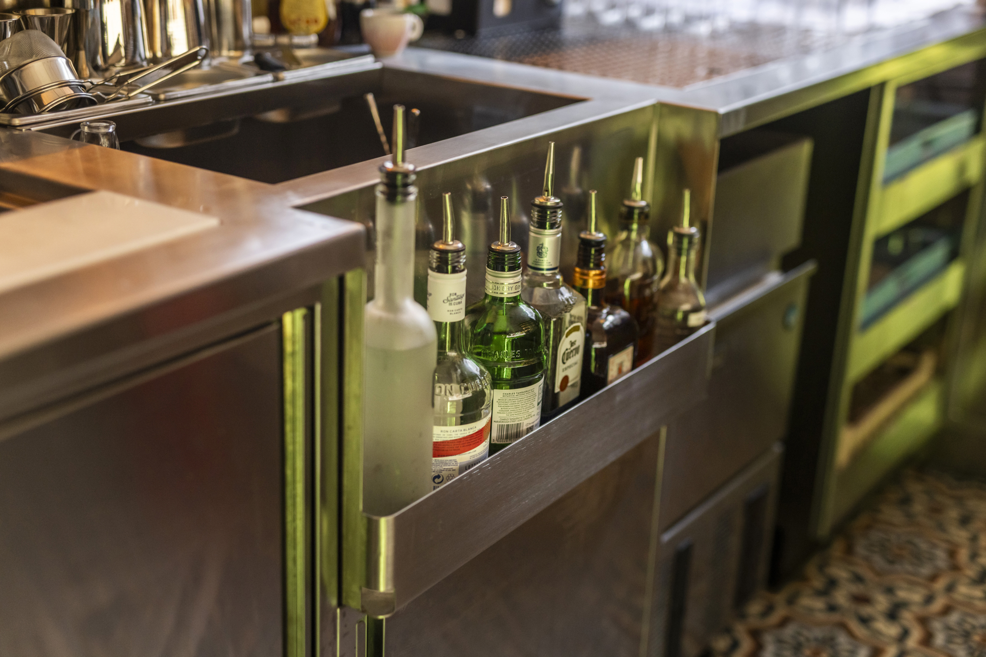 Under disken er der skuffer og skabe til opbevaring af glas og service til de enkelte funktioner. Der er også indbygget isterningemaskine, glasopvaskemaskine og et antal backbar-moduler med glasfront fra GAMKO.