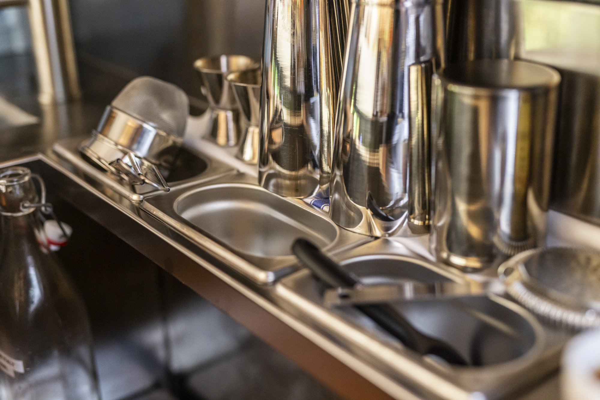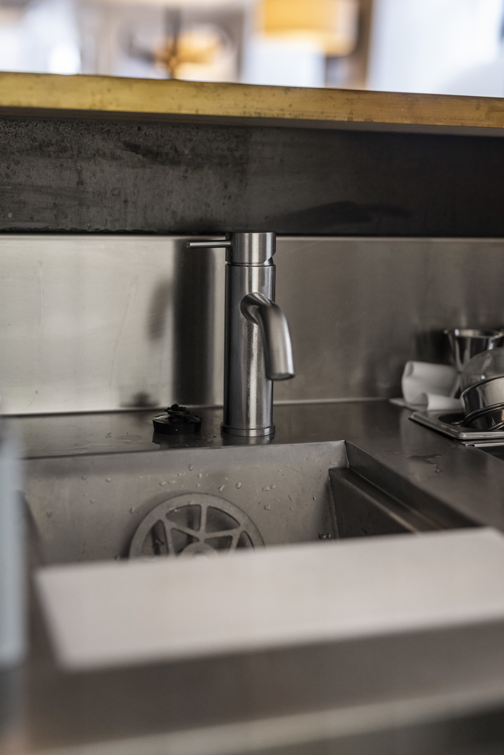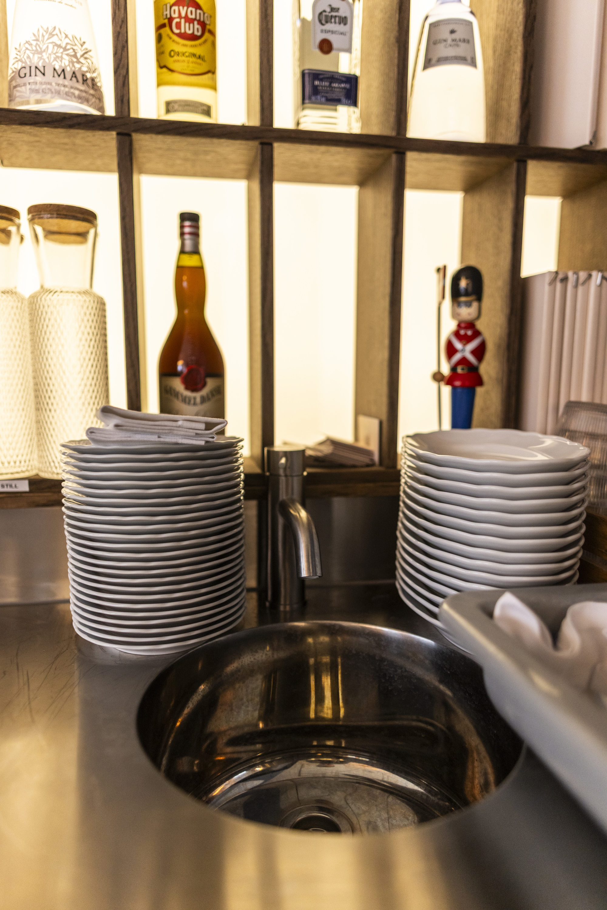 Tjeneren har alt det, der skal bruges til den enkelte funktion lige ved hånden, og meget er indbygget i den rustfrie ståbordplade: