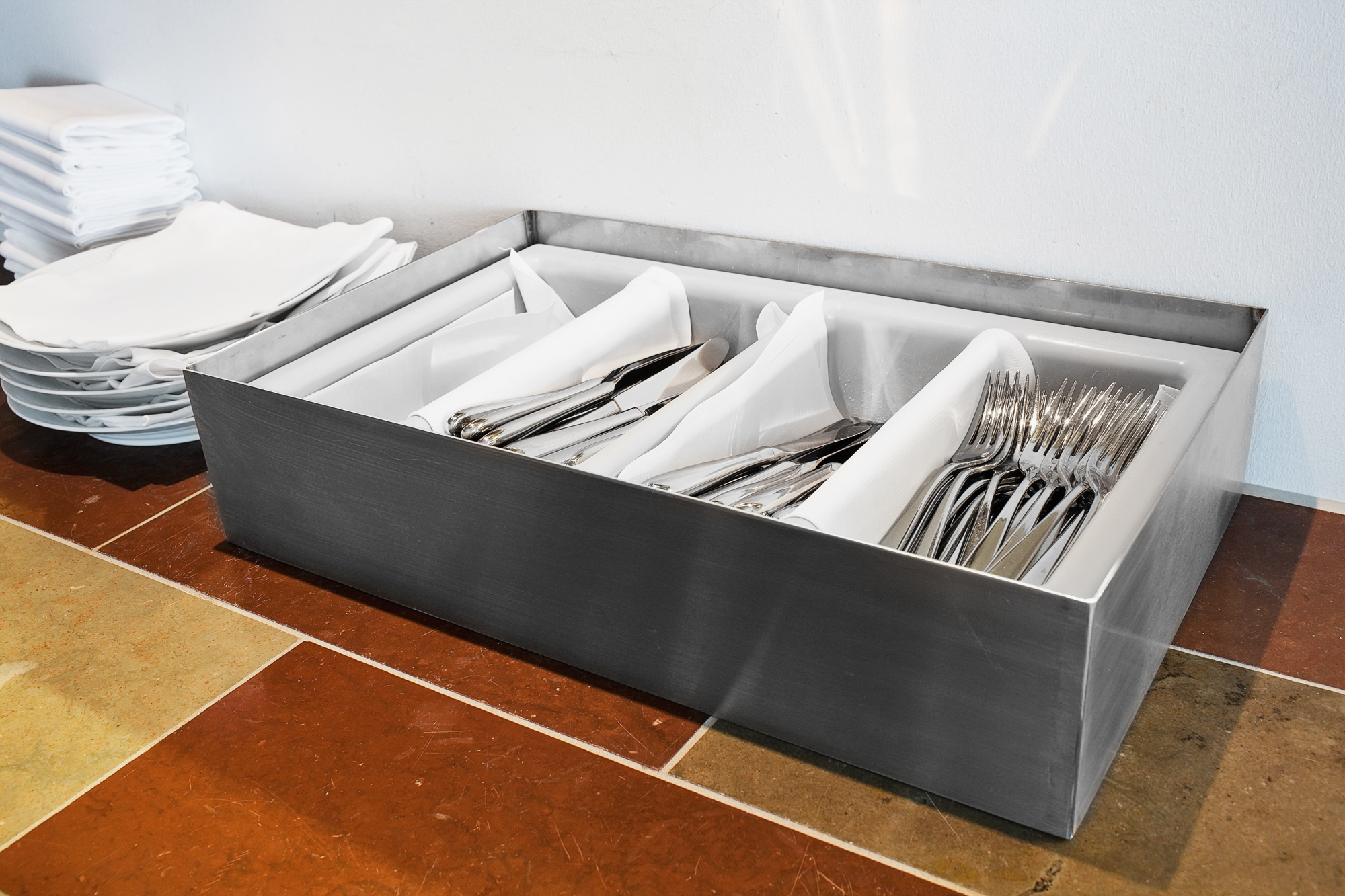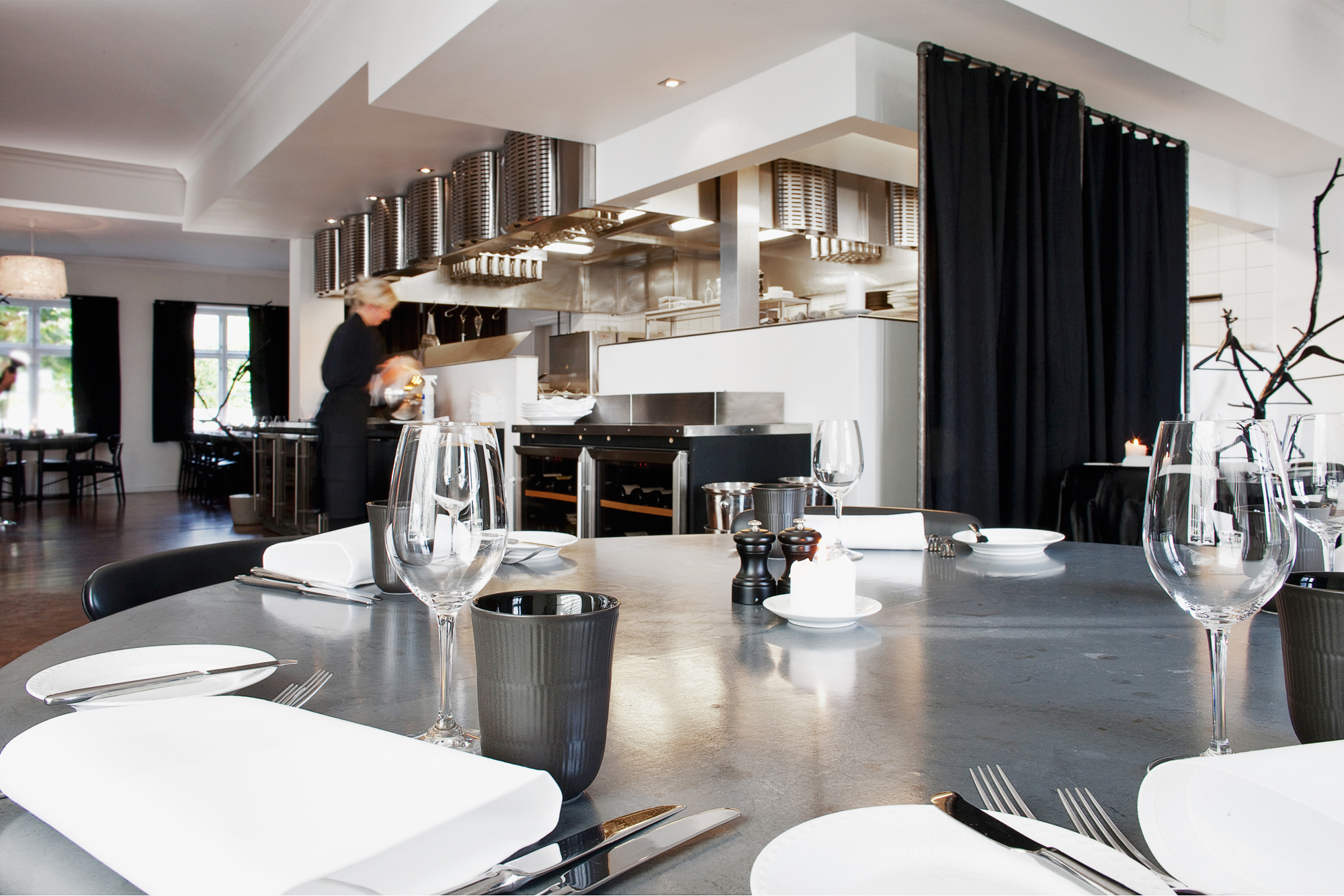 Tjenerstationen er placeret op ad det åbne køkken og indeholder plads til tallerkener, bestik, servietter, lys, vinkøleskabe mv.